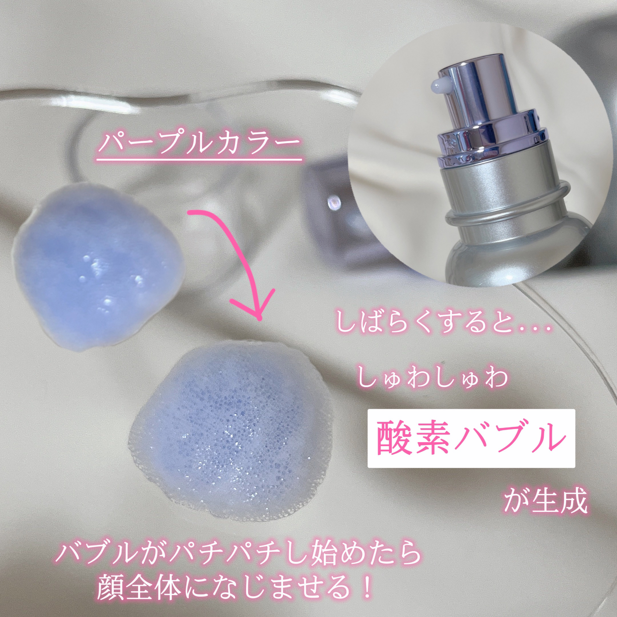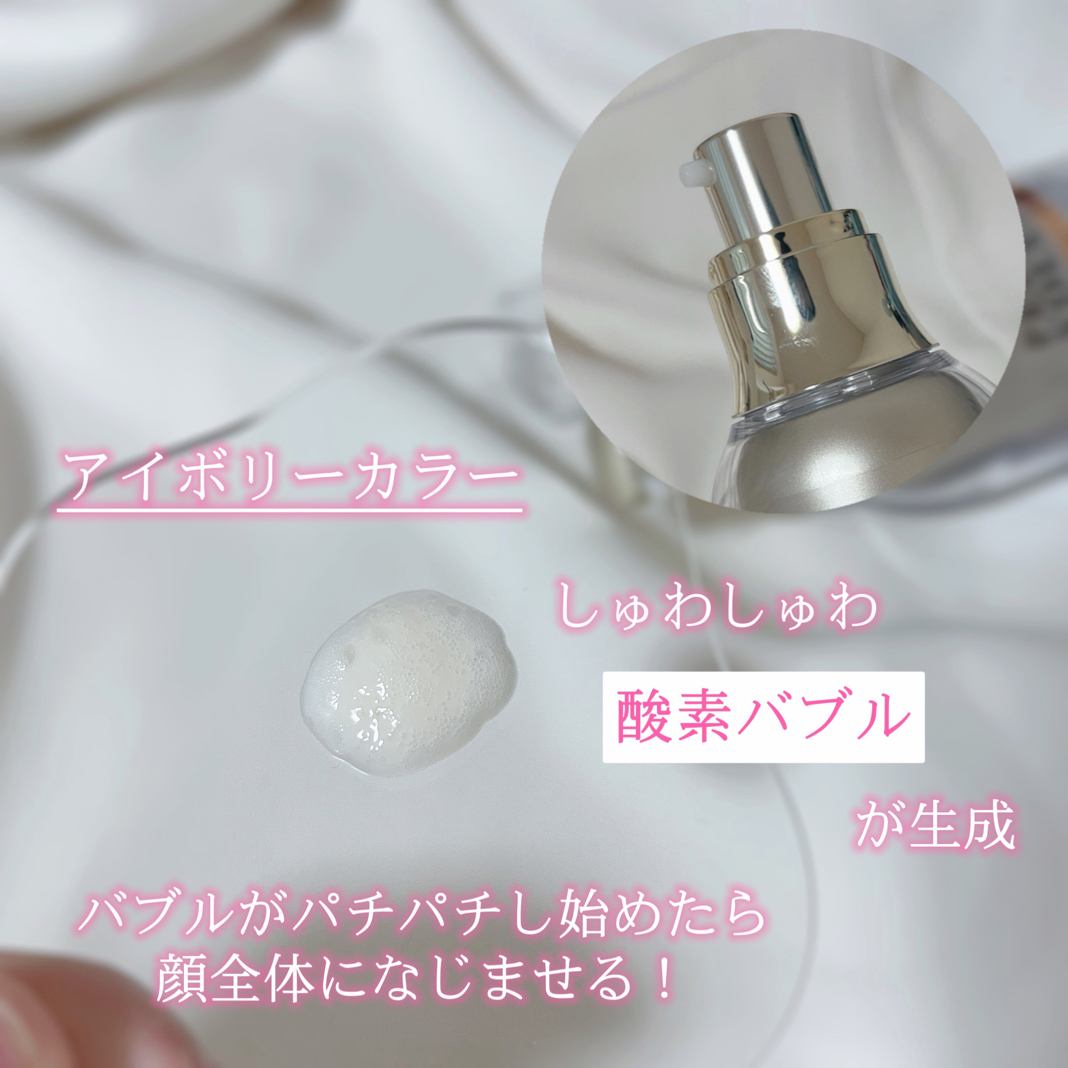 | 柔らかい乳液のようなテクスチャーのエッセンスをお肌に塗ると、たちまちしゅわしゅわと泡が出る…!! | 詳細を見る | |||