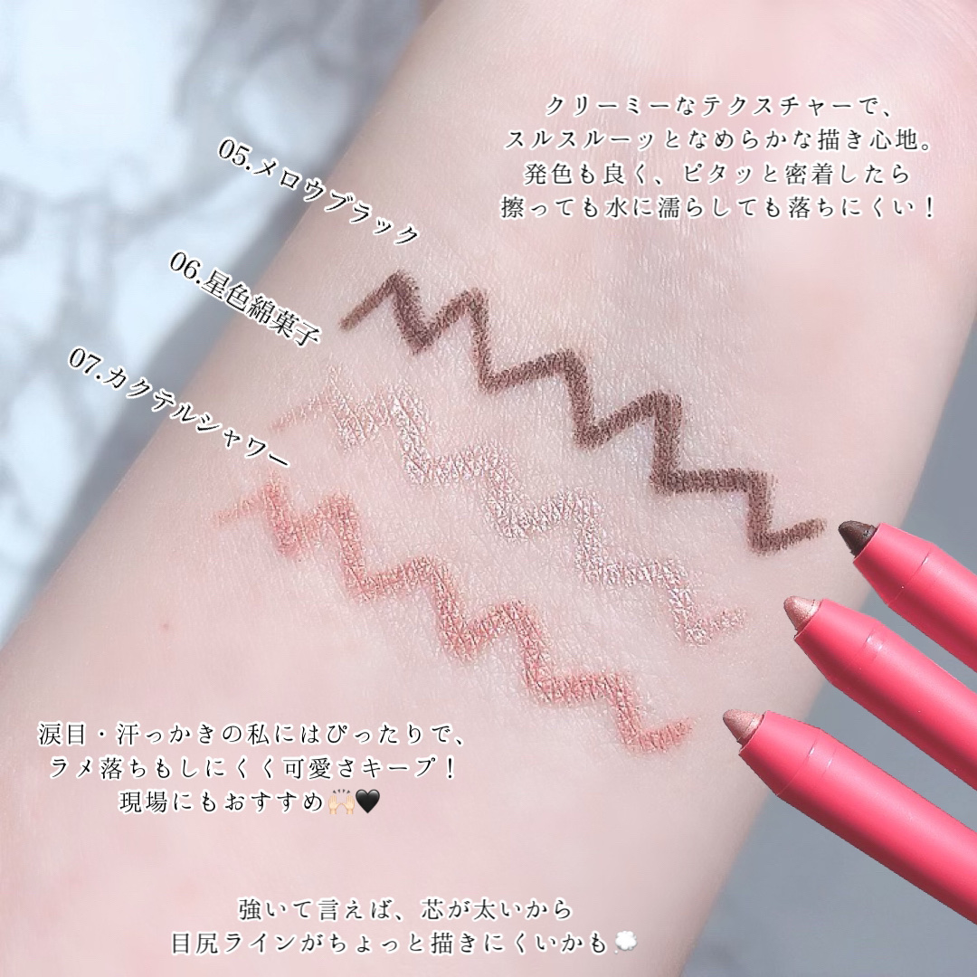 アイライナーとしてだけでなく、アイシャドウとしても使えるアイライナー。 芯が柔らかくて、まぶたの上をスルスルすべってくれて描きやすい✨ 一回密着してくれると指で軽くこすってもヨレなくて、夏にも大活躍しそうだよ。