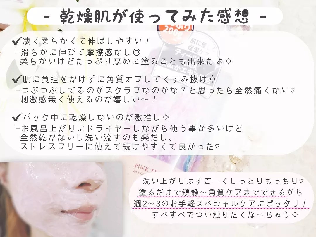 - 柔らかいテクスチャーの洗い流すパック。 角質ケアをし肌を滑らかに整え、さらに洗いあがりもつっぱり感を感じにくく、しっとり潤います。