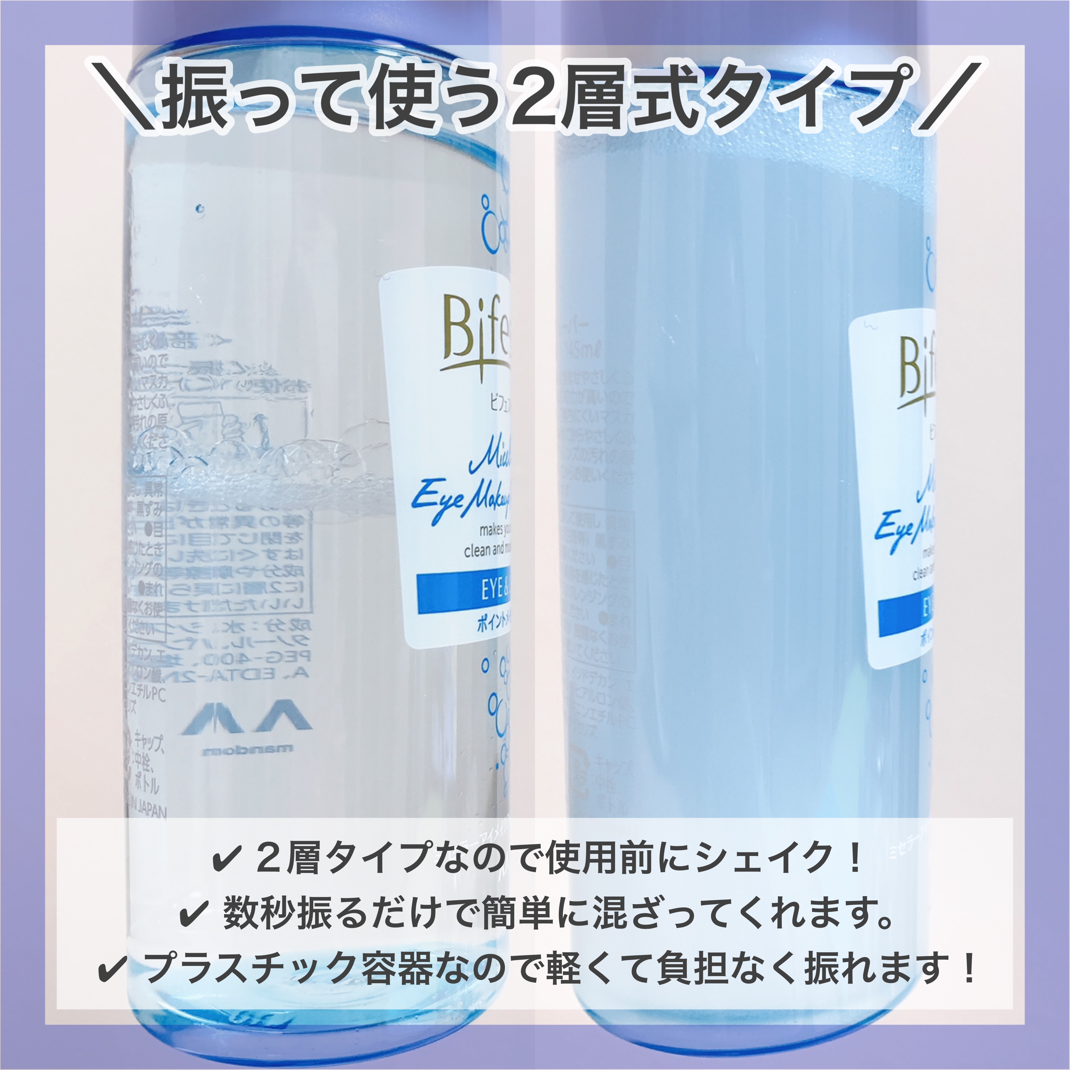 ビフェスタさまのアンケート企画でいただきました🖤 ウォータープルーフもするんと落とす二層式ポイントメイクリムーバー🌷ビフェスタミセラーアイメイクアップリムーバー使い方は、2層式なのでシャカシャカよく振ってからコットンに適量(500円硬貨大)含...