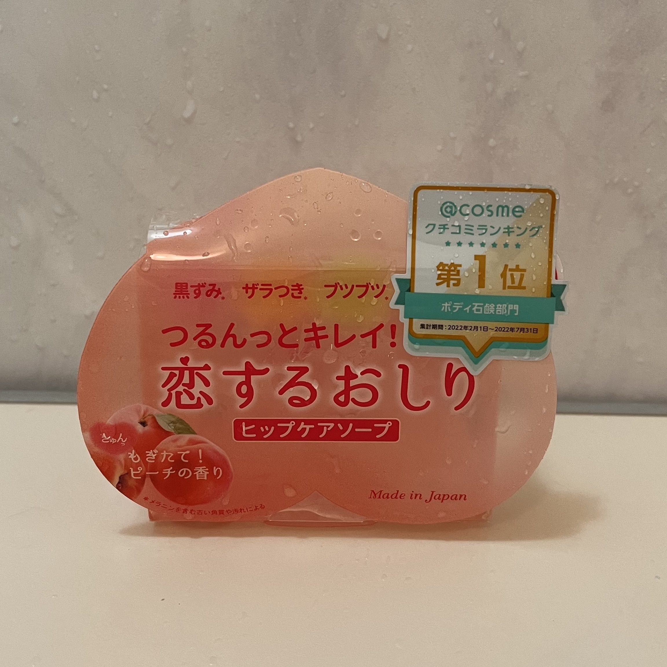 - 恋するおしり ヒップケアソープ おしりの黒ずみ・ザラつき・ブツブツにくるくる直接洗いの簡単ケア! (1)余分な古い角質を落とす:角質ケア スクラブ※1&ピーリング成分※2配合 【モモ核、マンナン※1 グルコノバクター/ハチミツ発酵液、 リンゴ酸・乳酸・クエン酸※2】 (2)必要なうるおいを守る:保湿ケア 6種※3の美容保湿エッセンスを配合 【モモ葉エキス、モモ種子エキス、ビワ葉エキス、キウイエキス、 アーチチョーク葉エキス、アロエベラ液汁※3】 ◎「きゅんっ」とする もぎたて!ピーチの香り