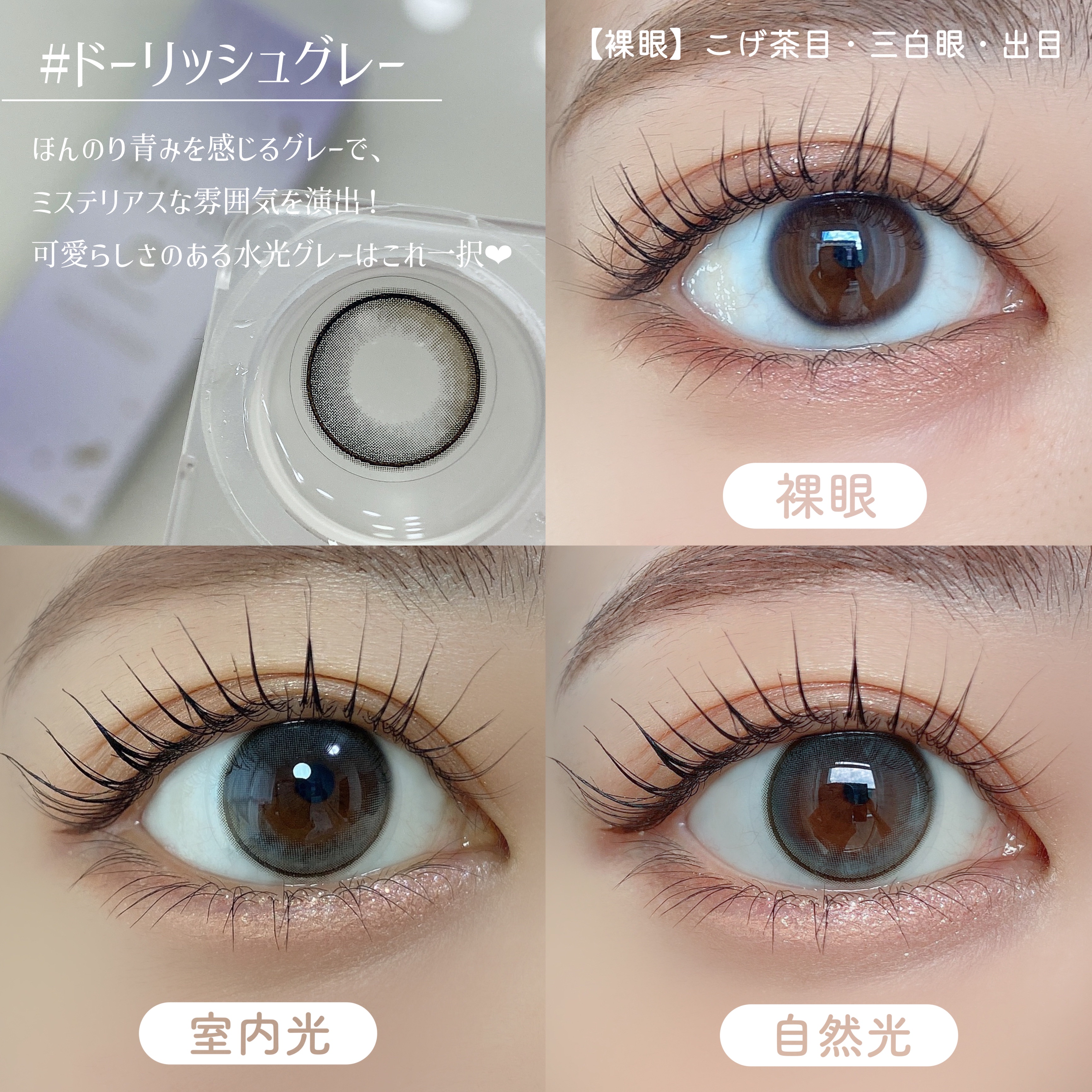 グレーの水光グラデーションが瞳に馴染むのに、細い黒フチのおかげで瞳がくりっとしてみえるよ🩶 私が使用したのは1DAYで ❤︎ UVカット効果 ❤︎ 高含水 ❤︎ イオン性 ❤︎ サンドイッチ構造の特徴があるよ。 乾燥しずらいと感じたのでイベントにもぴったりだと思います🎀 ᩚ
