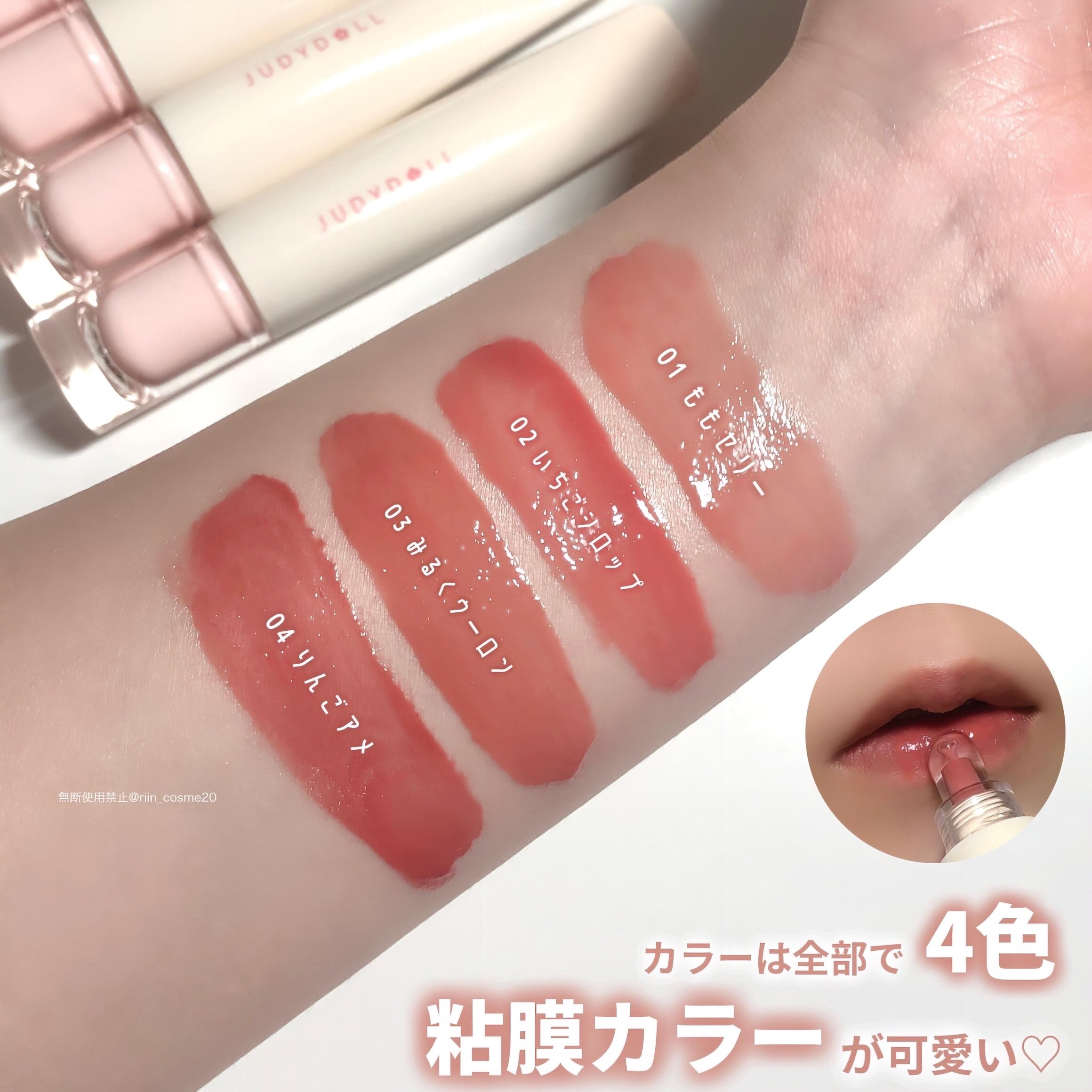 - 保湿成分たっぷりで、うるうるのぽってり唇*1を長時間演出。 透け感×馴染みのいいカラーで、いつものリップに潤いとあざとさをプラス! ノールックで塗り直しできるので、学校やお仕事の日にもオススメ。 01 ももドロップ ももドロップはドロップのような透け感と低彩度のももピンクで一番*2ナチュラルなカラー。 赤ちゃんのように自然な血色感で、白湯メイクにオススメ。 02 いちごジャム いちごジャムはジャムのようなぷるぷる感と、キュートな少女ピンクの定番カラー。 甘くてカワイイ雰囲気をまといたい日や、純欲メイクにオススメ。 03 みるくウーロン みるくウーロンはクリーミーなベージュウーロンカラーで一番*2なじみのいい粘膜つやカラー。 ちょっと血色を足したいすっぴんメイクや、スクールメイク、お仕事メイクにオススメ。 04 りんごアメ りんごアメは完熟りんごアメのようなちゅるちゅる火照りレッドカラー。 ぽってりリップで色気を出したい日や、ベースリップの発色が物足りない時にも。 *1メイク効果 *2ブランド内において