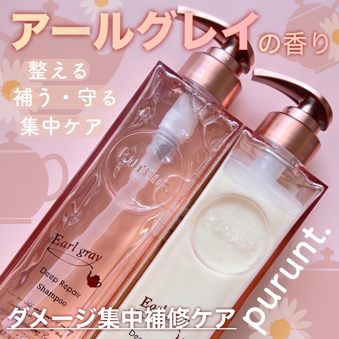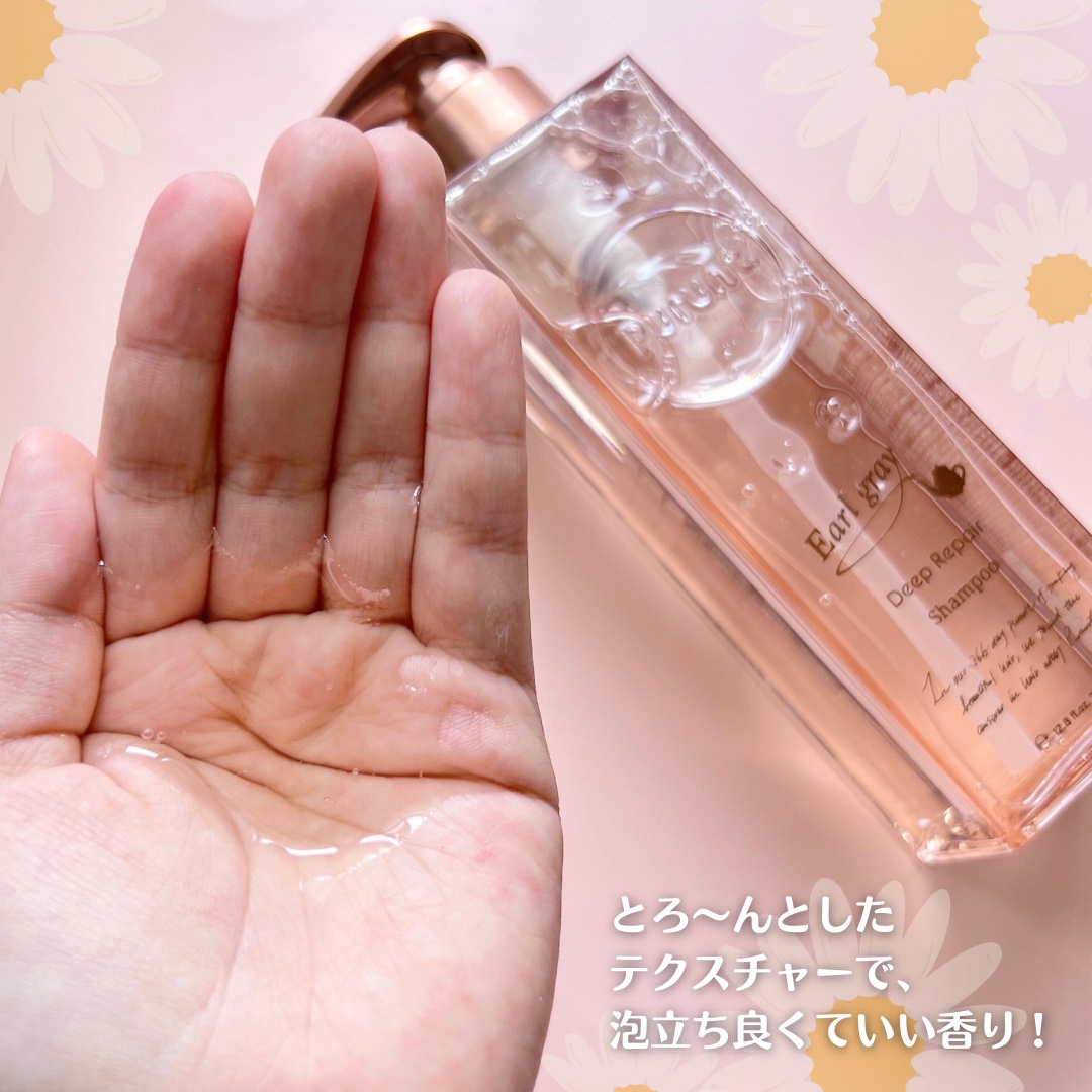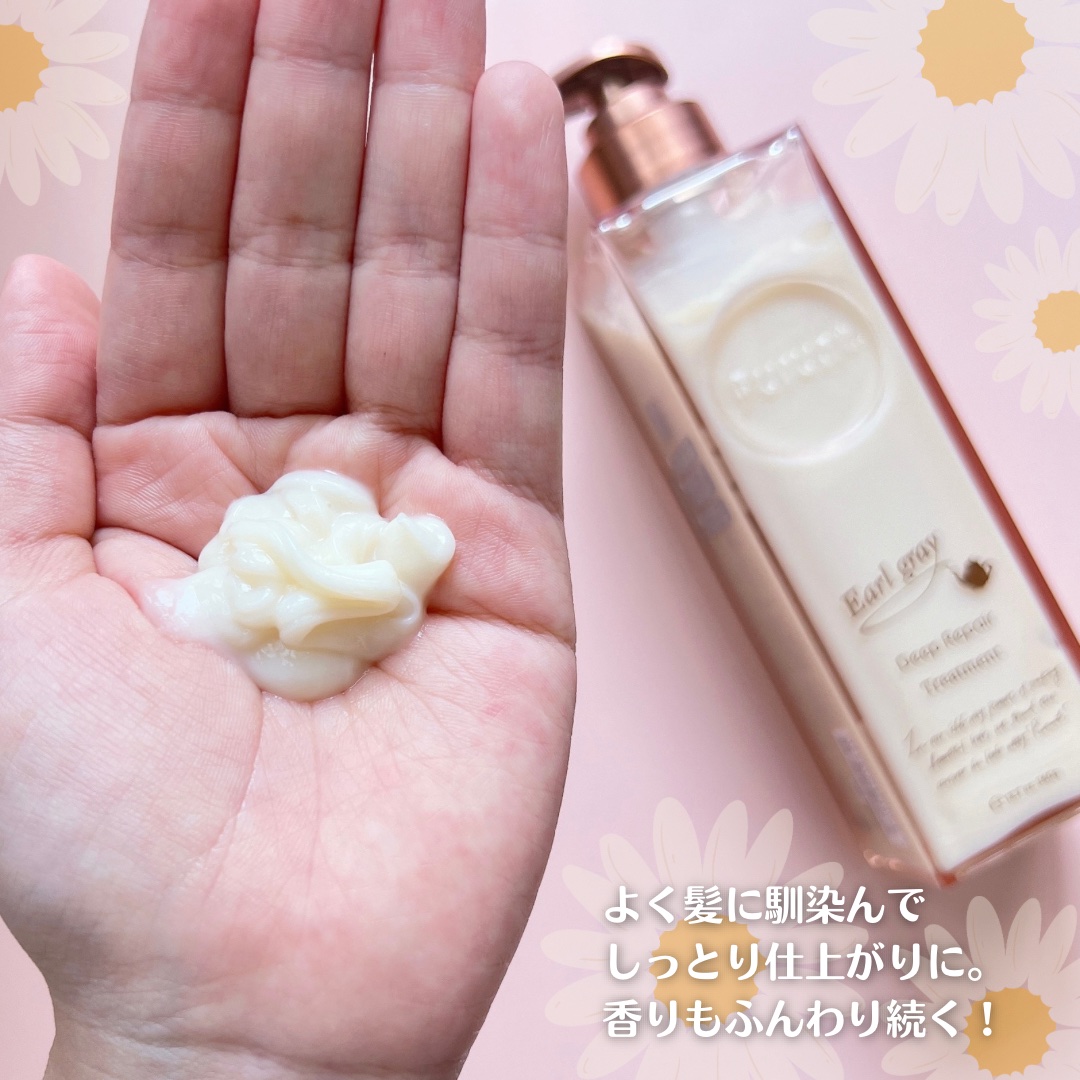 上品な紅茶の香りに安らぎをもたらす金木犀や爽やかなベルガモットなどの香りを加えた心安らぐアールグレイティーの🫖香り 整える+補う•守る+集中ケア 隙なし3段階補修ケアのアプローチで髪ダメージに補修力と潤いを与えます! 癒される香りがします♪アールグレイとくればベルガモットの香りそれに金木犀が加わり華やかな紅茶の香りにうっとり🥰