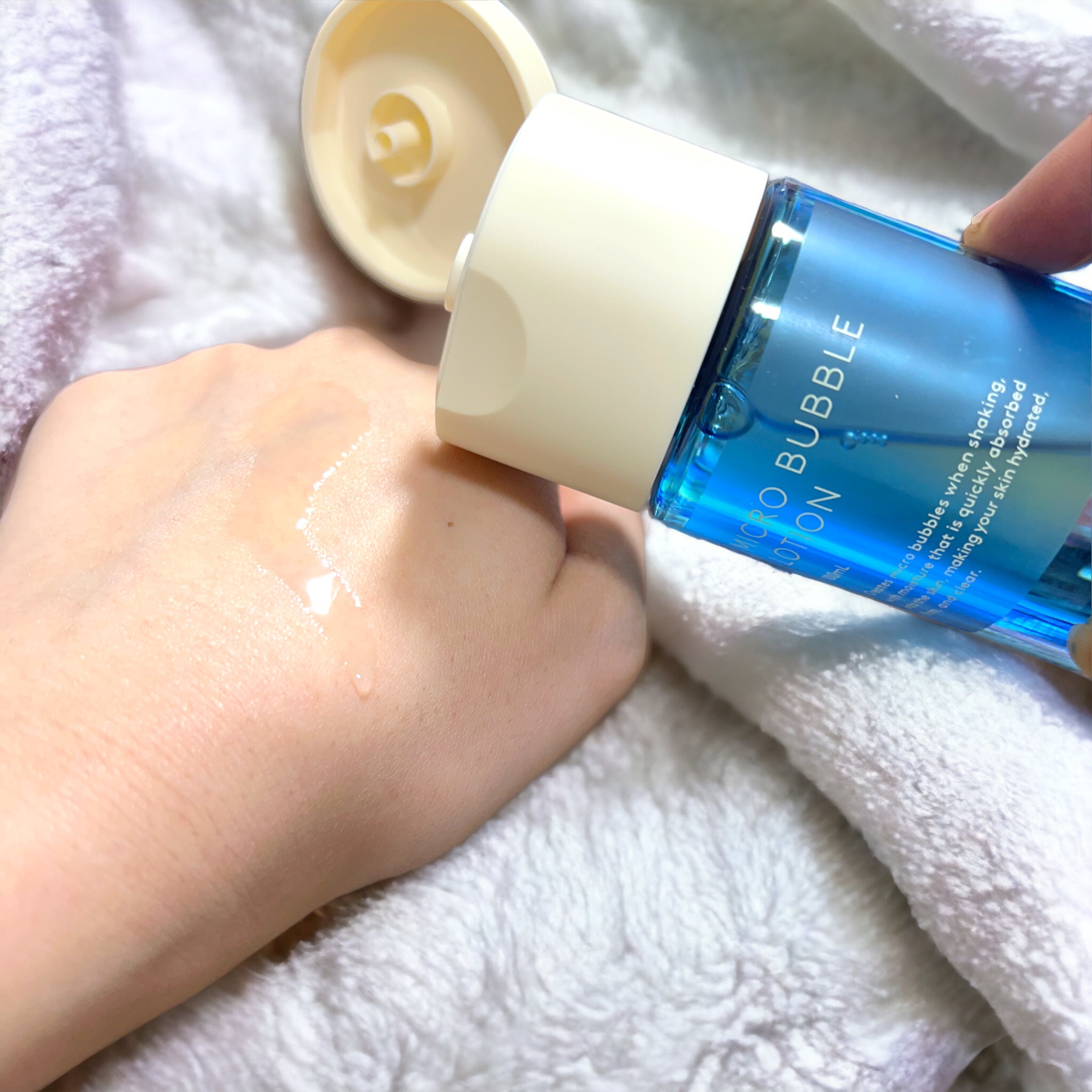 振ってファインバブルを発生させる攪拌ボール入りのボトルが印象的🫧 目に見えない程の微細泡で浸透力*UPも期待されてる🆙 ほんの少しトロミのあるテクスチャーで肌馴染みも良い◎
