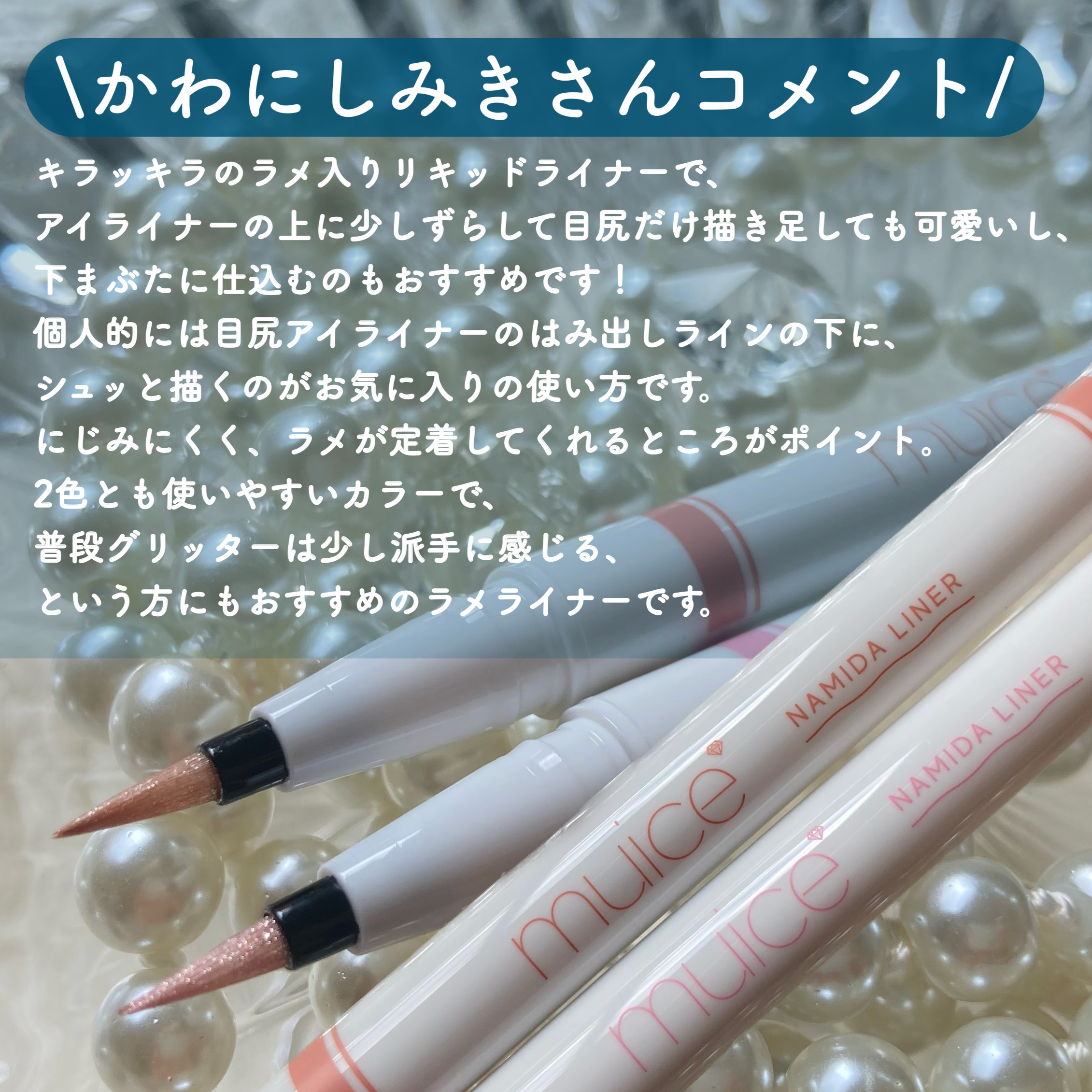 めっちゃキラキラ︎☆めっちゃ可愛い♡💜muiceうるみリキッドライナー(数量限定)Won02クリアスイートピー繊細ラメ高配合、大小さまざまなパール配合で上品な立体感のある仕上がりに。涙袋や目尻に仕込むことで自然なうるみ目元を演出。ラメが描きや...