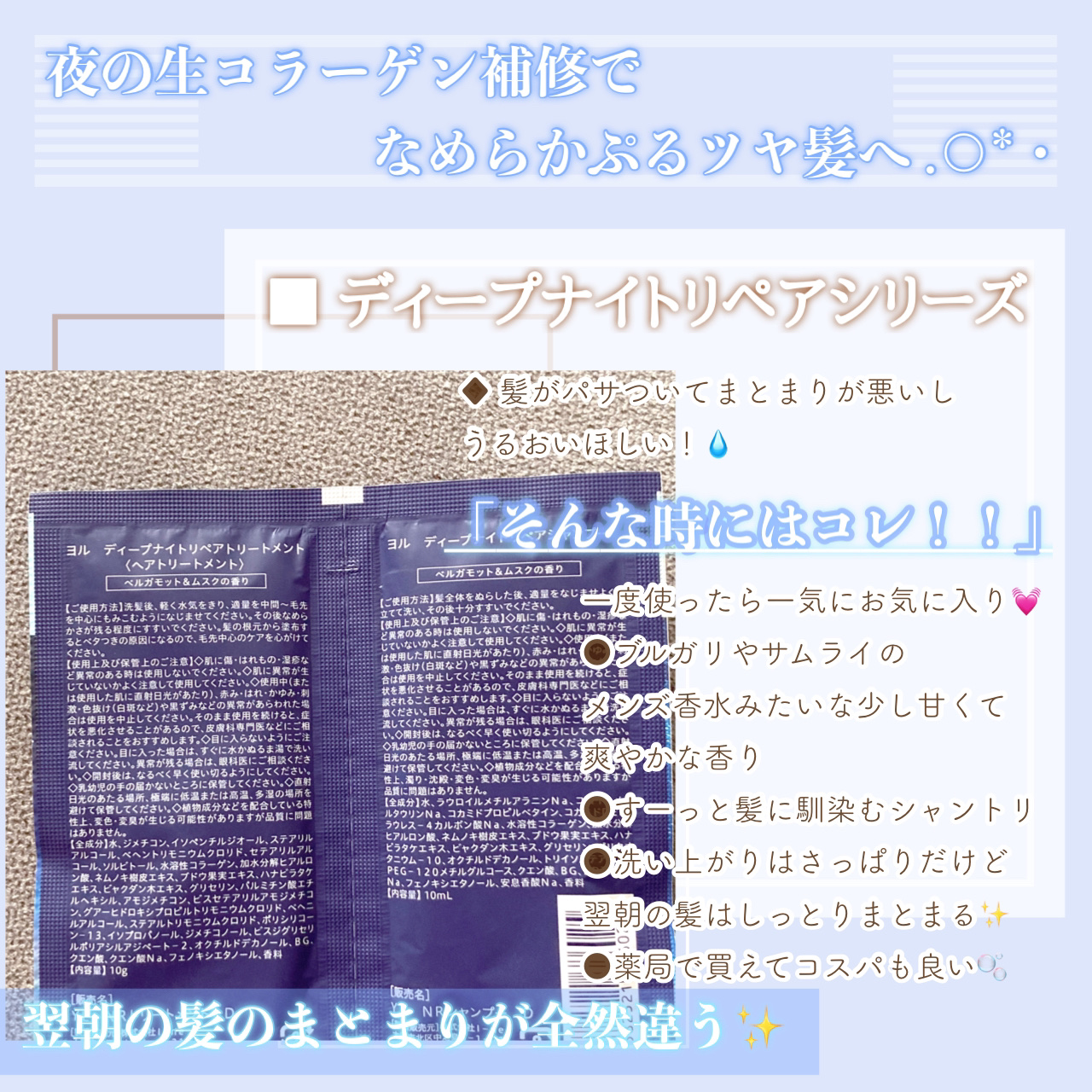 YOLU▷ディープナイトリペアシャンプー泡立ち◎で洗いあがりはきしまずしっとり✨️▷ディープナイトリペアトリートメントなめらかなテクスチャーで髪になじませやすく、洗いあがりはしっとりなめらか✨️ドライヤー後はまとまりが良くなりしっとりサラ...