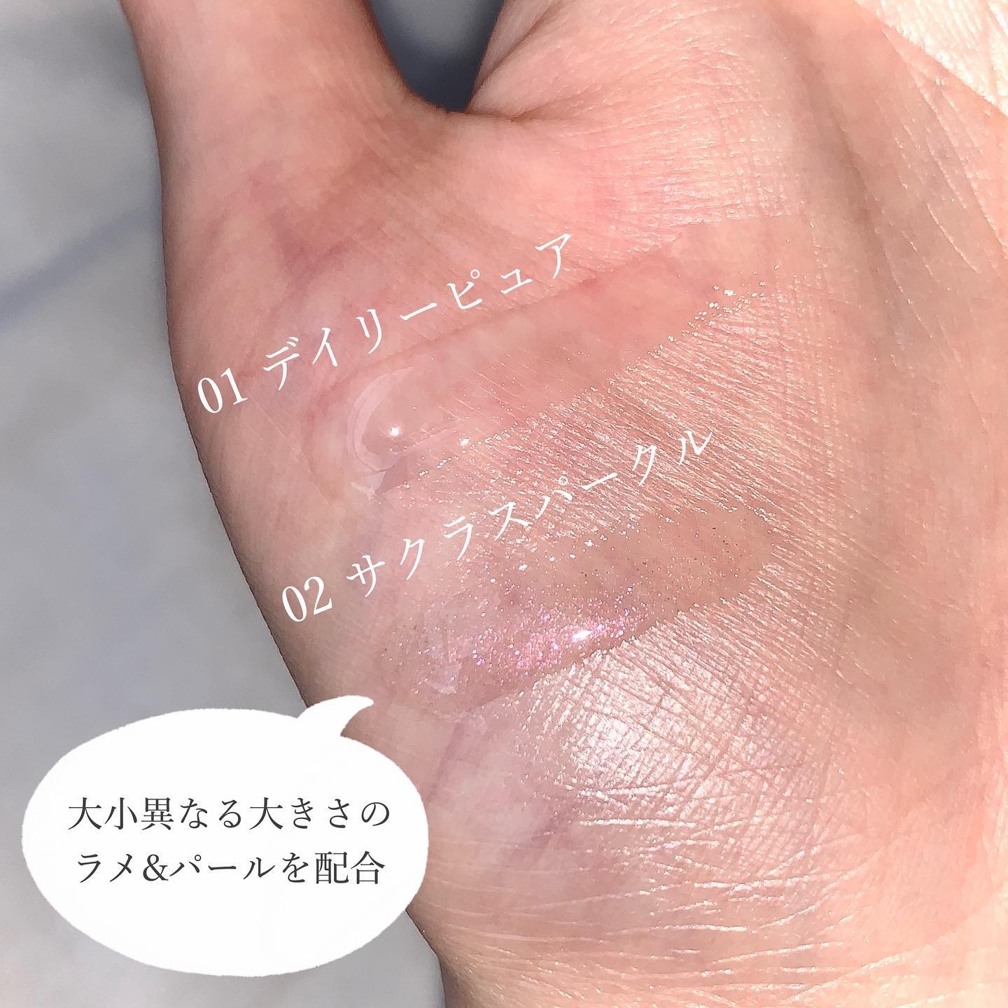 01 クリアタイプで普段使いしやすい。日頃の乾燥対策にも! 02 ピンクラメ入りで単品使いでも◎細かいラメなので使いやすい🫶 チップがシリコンタイプなので塗りやすく、拭き取れるので衛生的。