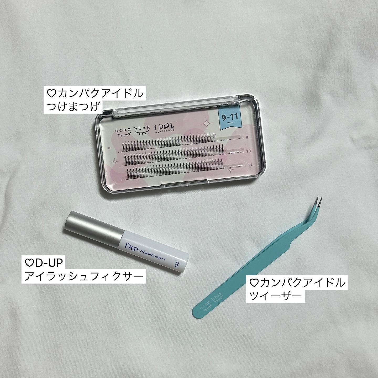 カンパクのアイドルラッシュにはA型とW型の2種類があってそれぞれ9mm、10mm、11mm、9〜11mmミックスの4種類から好きなものが選べます🥰 韓国アイドルのような束感まつげが簡単に! 個人的にはA型のほうが好きだけど、ファサファサまつげに仕上げたい方はW型がいいかも💗 カンパクのつけまはもちろんおすすめなんだけど、ピンクのツイーザーが本当に使いやすいので是非あわせて使ってみてほしいです🌟