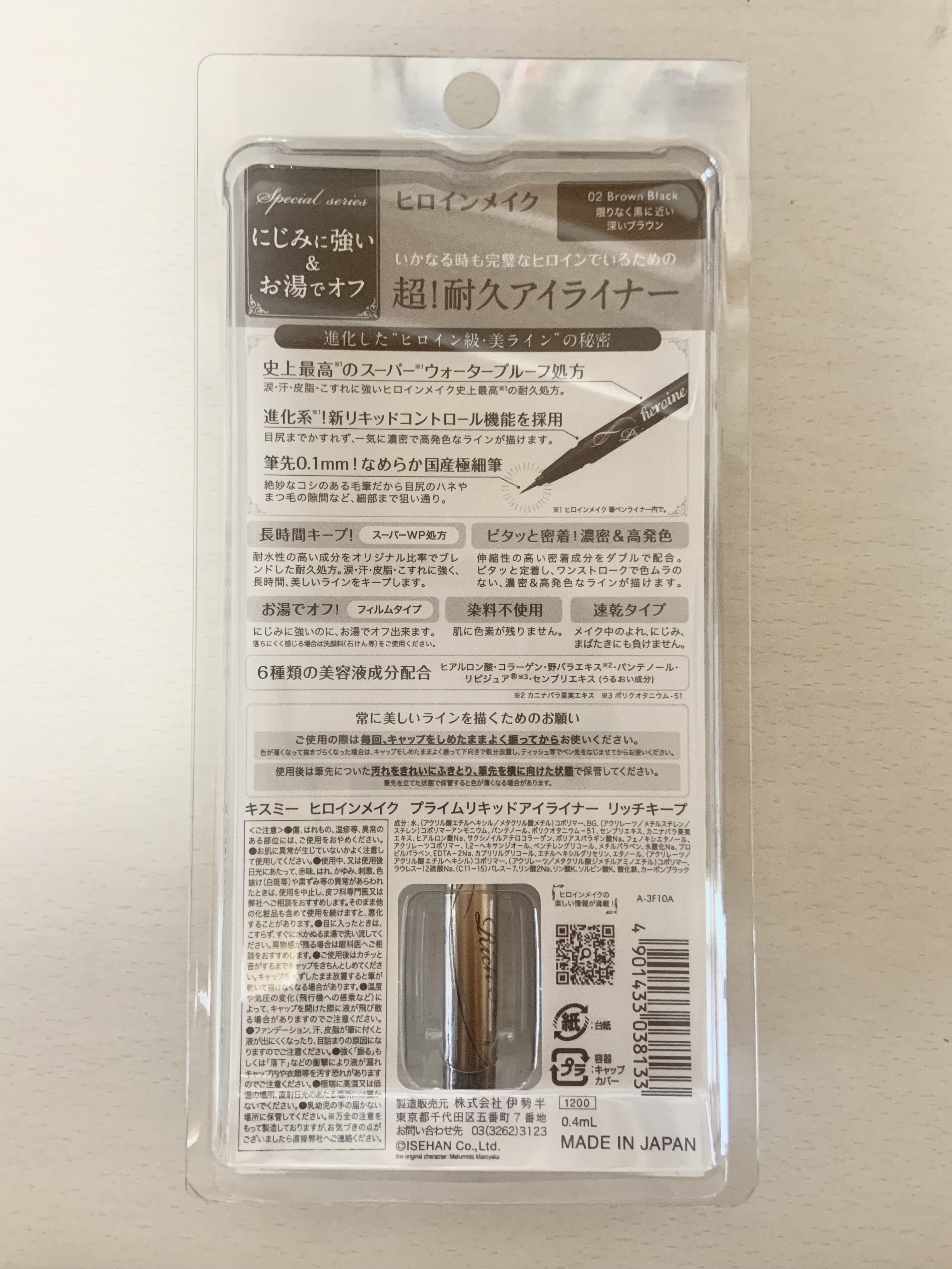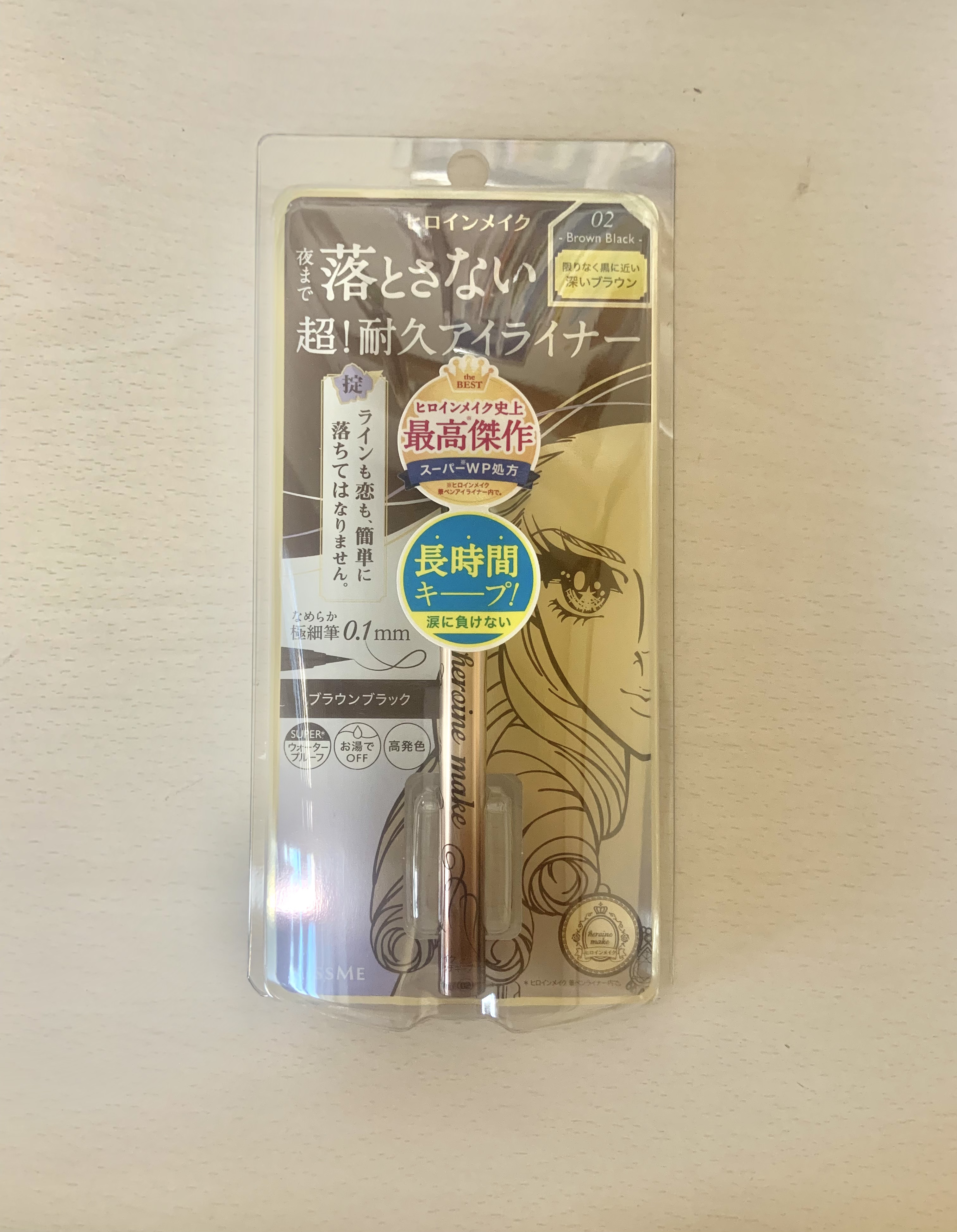 - ヒロイン史上最強※1 夜まで落とさない! 超!耐久リキッドアイライナーが新登場! ■超!耐久 スーパーウォータープルーフ 新耐久性成分と新高密着成分で、ヒロインメイク史上最高※1の耐久性を実現。 涙・汗・皮脂・こすれに強く、1日中※2美しいラインをキープします。 ※1 ヒロインメイク 筆ペンライナー内で。 ※2 日中の活動時間。伊勢半調べ。効果には個人差があります。 ■なめらかな描き心地と高発色 ヒロインメイク初となる新リキッドコントロール機能を採用。 目尻までかすれず、高発色の美しいラインが一気になめらかに描けます。 ■描きやすい!筆先0.1mmの国産極細筆 描きやすさにこだわった、絶妙なコシのある極細筆を採用。 目尻のハネやまつ毛の隙間など、細部まで狙い通りに描けます。 ■染料不使用 染料不使用で肌に色素が残りません。 ■にじまないのにお湯でオフ 高い耐久性でありながら、ぬるま湯で落とせるので日常使いに最適です。 *耐水性が高い処方です。落ちにくく感じる場合は洗顔料(石けん等)をご使用ください。 ■6種類の美容液成分配合 ■抜群の速乾性 速乾性に優れ、メイク中のよれ、にじみに、まばたきにも負けません。