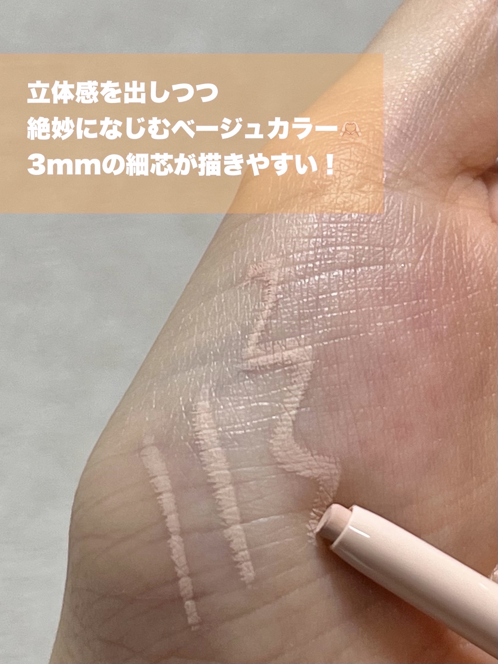 繰り出し&繰り戻し可能、なめらかな描き心地でヨレにくく 汗・皮脂・涙・こすれに強いウォータープルーフ処方 価格は660円(税込)と手頃ながら、発色や質感が自然で大人のメイクにも馴染むカラー♡ ナチュラルさが絶妙で01のなじみベージュを涙袋メイクに愛用しておりまして、明るくなりすぎず程よい立体感が出る仕上がりが好きすぎてストックも買っていました🤍