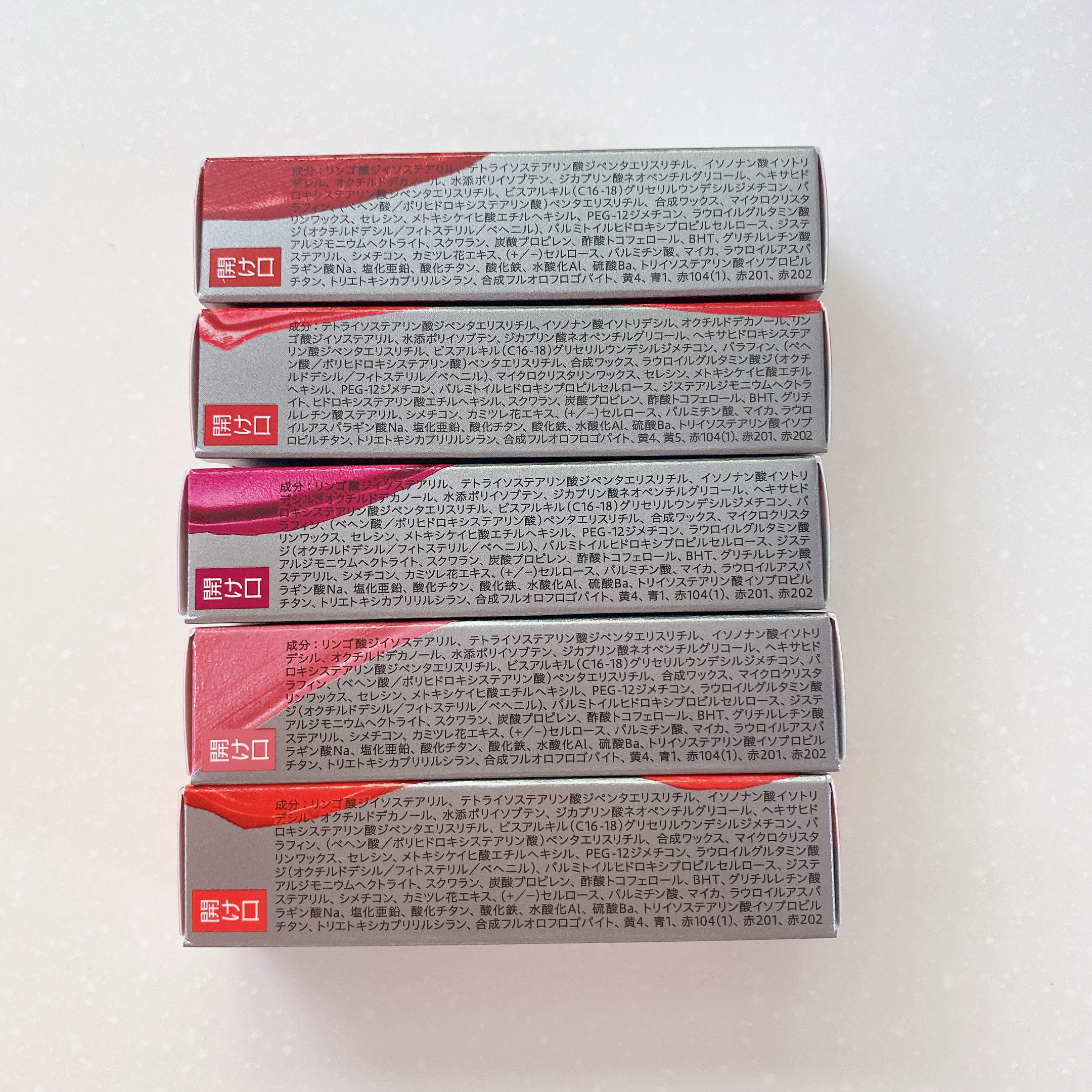 - <01> リンゴ酸ジイソステアリル、テトライソステアリン酸ジペンタエリスリチル、イソノナン酸イソトリ デシル、オクチルドデカノール、水添ポリイソブテン、ジカプリン酸ネオペンチルグリコール、ヘキサヒド ロキシステアリン酸ジペンタエリスリチル、ビスアルキル(C16-18)グリセリルウンデシルジメチコン、パ ラフィン、(ベヘン酸/ポリヒドロキシステアリン酸)ペンタエリスリチル、合成ワックス、マイクロクリスタ リンワックス、セレシン、メトキシケイヒ酸エチルヘキシル、PEG-12ジメチコン、ラウロイルグルタミン酸 ジ(オクチルドデシル/フィトステリル/ベヘニル)、パルミトイルヒドロキシプロピルセルロース、ジステ アルジモニウムヘクトライト、スクワラン、炭酸プロピレン、酢酸トコフェロール、BHT、グリチルレチン酸 ステアリル、シメチコン、カミツレ花エキス、(+/-)セルロース、パルミチン酸、マイカ、ラウロイルアスパ ラギン酸Na、塩化亜鉛、酸化チタン、酸化鉄、水酸化Al、硫酸Ba、トリイソステアリン酸イソプロピル チタン、トリエトキシカプリリルシラン、合成フルオロフロゴパイト、黄4、青1、赤104(1)、赤201、赤202 <02> テトライソステアリン酸ジペンタエリスリチル、イソノナン酸イソトリデシル、オクチルドデカノール、リン ゴ酸ジイソステアリル、水添ポリイソブテン、ジカプリン酸ネオペンチルグリコール、ヘキサヒドロキシステア リン酸ジペンタエリスリチル、ビスアルキル(C16-18)グリセリルウンデシルジメチコン、パラフィン、(ベヘ ン酸/ポリヒドロキシステアリン酸)ペンタエリスリチル、合成ワックス、ラウロイルグルタミン酸ジ(オクチ ルドデシル/フィトステリル/ベヘニル)、マイクロクリスタリンワックス、セレシン、メトキシケイヒ酸エチル ヘキシル、PEG-12ジメチコン、パルミトイルヒドロキシプロピルセルロース、ジステアルジモニウムヘクトラ イト、ヒドロキシステアリン酸エチルヘキシル、スクワラン、炭酸プロピレン、酢酸トコフェロール、BHT、グリチ ルレチン酸ステアリル、シメチコン、カミツレ花エキス、(+/-)セルロース、パルミチン酸、マイカ、ラウロ イルアスパラギン酸Na、塩化亜鉛、酸化チタン、酸化鉄、水酸化Al、硫酸Ba、トリイソステアリン酸イソプ ロピルチタン、トリエトキシカプリリルシラン、合成フルオロフロゴパイト、黄4、黄5、赤104(1)、赤201、赤202 <03> リンゴ酸ジイソステアリル、テトライソステアリン酸ジペンタエリスリチル、イソノナン酸イソトリ デシル、オクチルドデカノール、水添ポリイソブテン、ジカプリン酸ネオペンチルグリコール、ヘキサヒド ロキシステアリン酸ジペンタエリスリチル、ビスアルキル(C16-18)グリセリルウンデシルジメチコン、パ ラフィン、(ベヘン酸/ポリヒドロキシステアリン酸)ペンタエリスリチル、合成ワックス、マイクロクリスタ リンワックス、セレシン、メトキシケイヒ酸エチルヘキシル、PEG-12ジメチコン、ラウロイルグルタミン酸 ジ(オクチルドデシル/フィトステリル/ベヘニル)、パルミトイルヒドロキシプロピルセルロース、ジステ アルジモニウムヘクトライト、スクワラン、炭酸プロピレン、酢酸トコフェロール、BHT、グリチルレチン酸 ステアリル、シメチコン、カミツレ花エキス、(+/-)セルロース、パルミチン酸、マイカ、ラウロイルアスパ ラギン酸Na、塩化亜鉛、酸化チタン、酸化鉄、水酸化Al、硫酸Ba、トリイソステアリン酸イソプロピル チタン、トリエトキシカプリリルシラン、合成フルオロフロゴパイト、黄4、青1、赤104(1)、赤201、赤202 <05> リンゴ酸ジイソステアリル、テトライソステアリン酸ジペンタエリスリチル、イソノナン酸イソトリ デシル、オクチルドデカノール、水添ポリイソブテン、ジカプリン酸ネオペンチルグリコール、ヘキサヒド ロキシステアリン酸ジペンタエリスリチル、ビスアルキル(C16-18)グリセリルウンデシルジメチコン、パ ラフィン、(ベヘン酸/ポリヒドロキシステアリン酸)ペンタエリスリチル、合成ワックス、マイクロクリスタ リンワックス、セレシン、メトキシケイヒ酸エチルヘキシル、PEG-12ジメチコン、ラウロイルグルタミン酸 ジ(オクチルドデシル/フィトステリル/ベヘニル)、パルミトイルヒドロキシプロピルセルロース、ジステ アルジモニウムヘクトライト、スクワラン、炭酸プロピレン、酢酸トコフェロール、BHT、グリチルレチン酸 ステアリル、シメチコン、カミツレ花エキス、(+/-)セルロース、パルミチン酸、マイカ、ラウロイルアスパ ラギン酸Na、塩化亜鉛、酸化チタン、酸化鉄、水酸化Al、硫酸Ba、トリイソステアリン酸イソプロピル チタン、トリエトキシカプリリルシラン、合成フルオロフロゴパイト、黄4、青1、赤104(1)、赤201、赤202 <07 ラズベリーチョコレート> テトライソステアリン酸ジペンタエリスリチル、イソノナン酸イソトリデシル、オクチルドデカノール、水添ポリイソブテン、ジカプリン酸ネオペンチルグリコール、リンゴ酸ジイソ