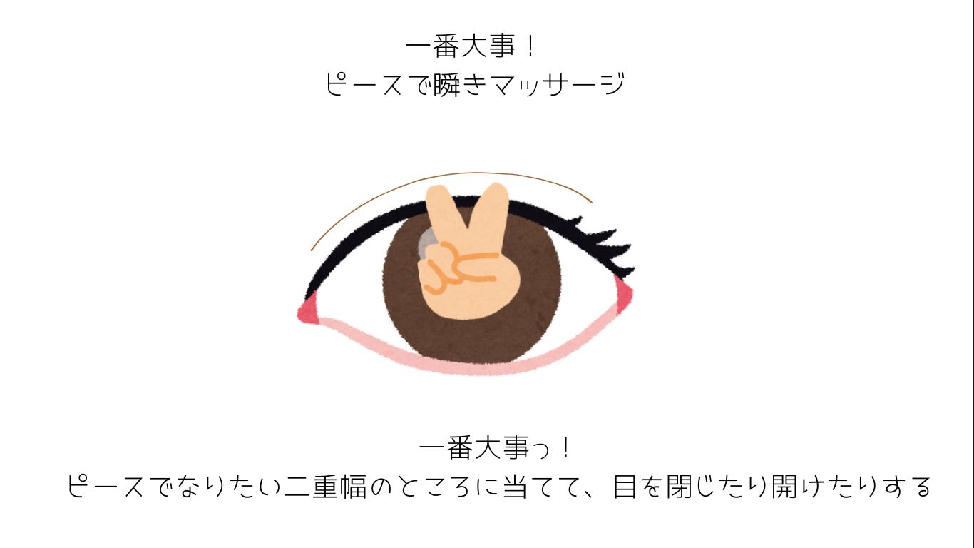 1つ目 親指グリグリマッサージやり方 親指の付け根で目頭をグリグリする ×5回 2つ目 眉毛オッケー!(?)やり方 眉毛をオッケーの手でつまんで、揺らしたりもんだりする 3つ目 一番大事! ピースで瞬きマッサージやり方 一番大事っ! ピースで、なりたい二重幅のところにおいて、目を閉じたり開いたりする