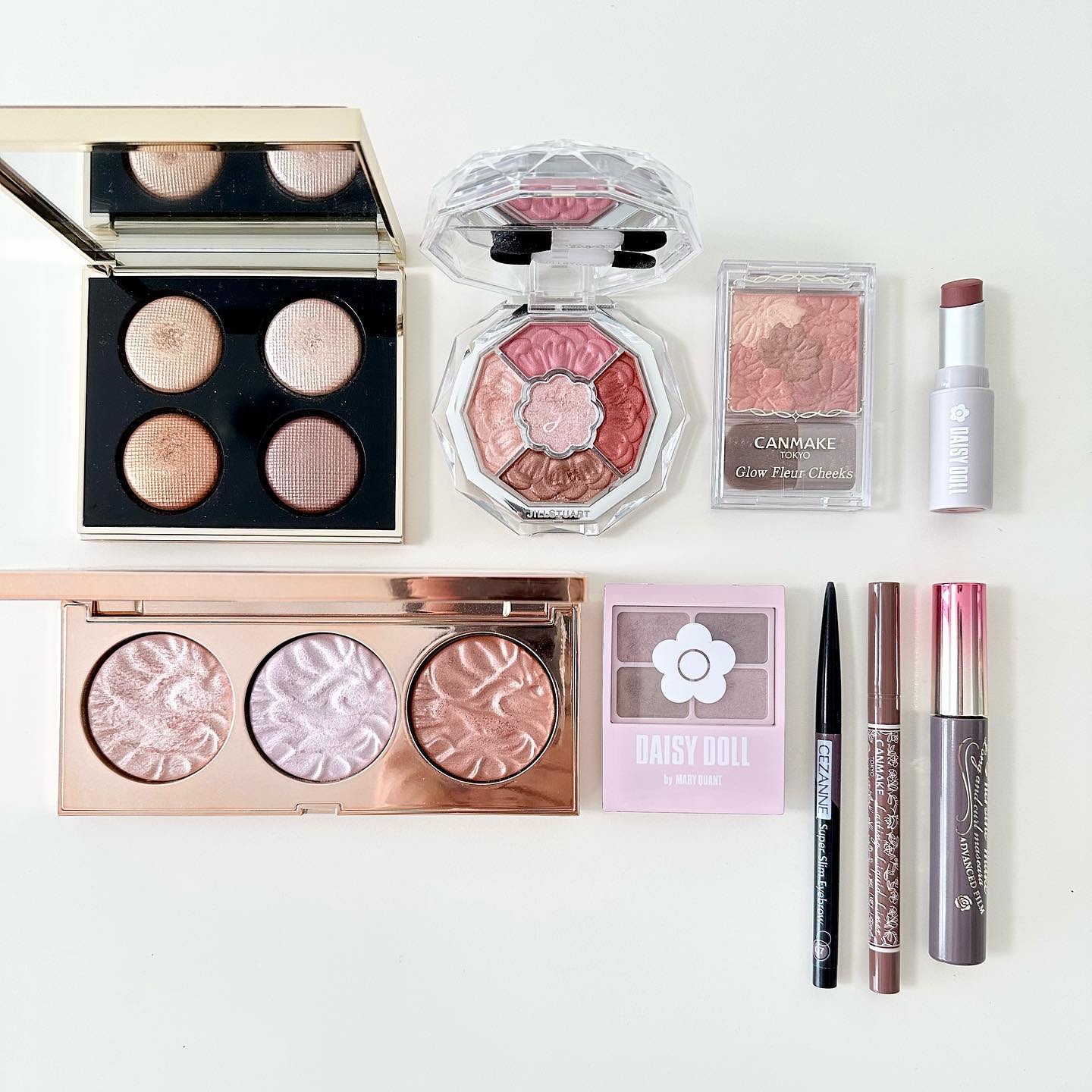 アイシャドウは実物の方が相当可愛い! 特に左上のラメの破壊力、、、 左側ボルドーは本当にふんわりと。 その上から右側のライラック?ピンクを 乗せると透明感爆発でした🥹👏🏻 本当にSUQQUは裏切らない可愛さ。 4月に発売されるもう一色のシグニチャーも、 5月発売のサマーもしっかり買うよ☺️❤️🔥