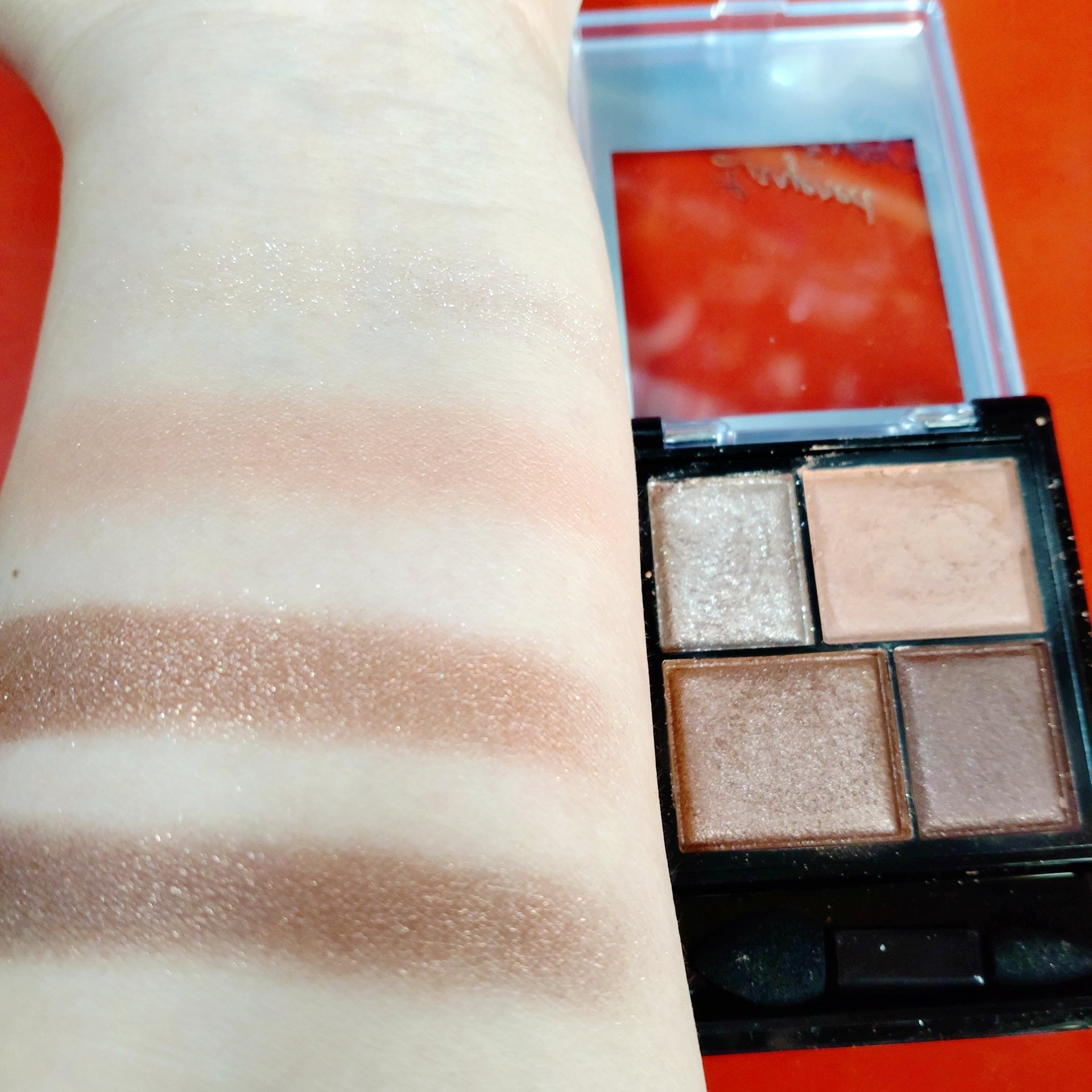 - 質感ミックスで上品にツヤめくアイカラーパレット ◇異なる質感で魅せる上品なツヤを演出 グリッター・マット・パールの3つの異なる質感の4色が入ったパレットで、上品なツヤや抜け感のある目もとに仕上げます。◇重ね方を変えることで、印象の違うアイメイクが楽しめます。 ◇しっとり密着して、美発色をキープ なめらかなパウダーがまぶたにしっとりとフィットして、つけたての美しい仕上がりをキープします。 ◇美容液成分配合 カモミラエキス(うるおい成分)配合。