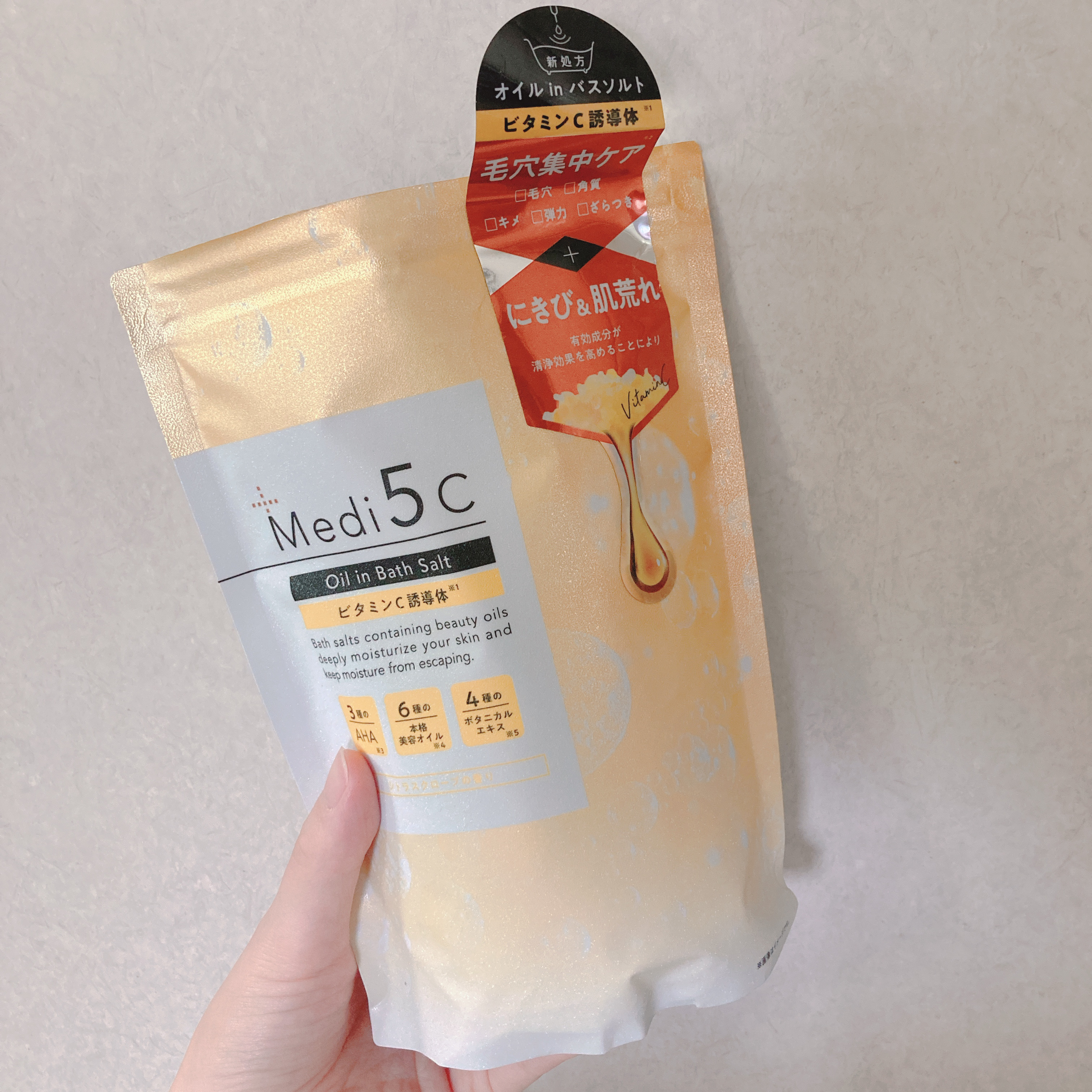 スキンケア × 身体メンテナンス を同時に叶える「#第3のバスソルト」 湯面に美容オイルが浮くオイルイン処方で、乳白色になります。 ニキビに悩む思春期の息子もとても気に入っています。