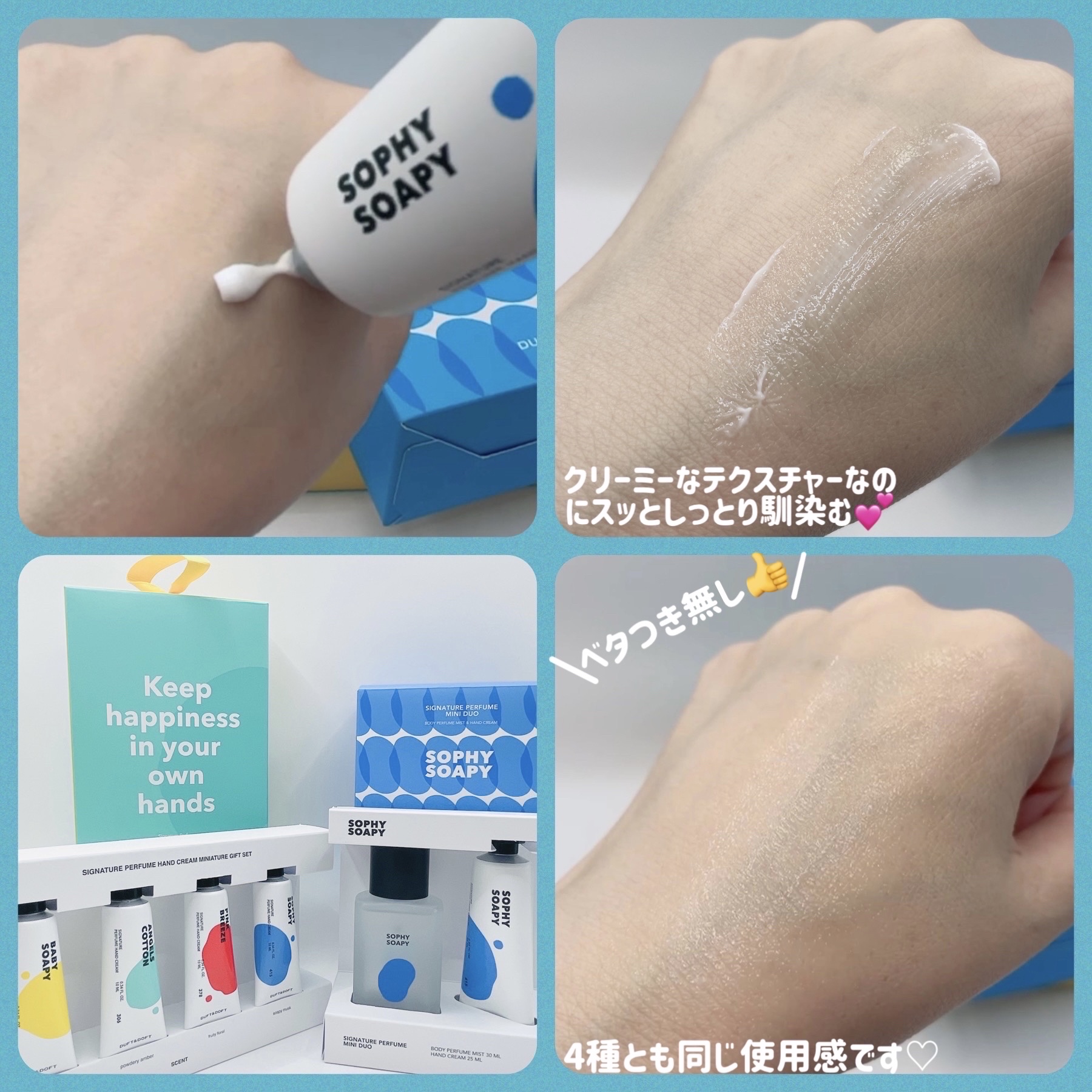 100時間熟成させた香りを適用したパフュームハンドクリームです。 ベタつかないテクスチャーで、ぬってのばした後、すぐに作業等、手が使えました。 私は💛Baby Soapyの香りが特に気に入りました。どの香りも男女関係なく使えそうです。