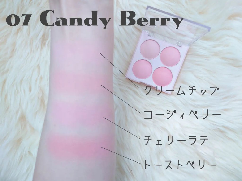 - <03 ピーチブレンディング> タルク、マイカ、酸化チタン、ポリメタクリル酸メチル、ラウロイルリシン、ジメチコン、黄5、ステアロイルオキシステアリン酸オクチルドデシル、リンゴ酸ジイソステアリル、水添野菜油、ミリスチン酸イソセチル、カプリリルグリコール、カプリル酸グリセリル、酸化鉄、エチルヘキシルグリセリン、トリエトキシカプリリルシラン、水添レシチン、黄4、合成フルオロフロゴパイト、赤226、赤201、水、水添ポリイソブテン、塩化Na、硫酸Na、パルミチン酸、トコフェロール <04 ベージュニット> タルク、マイカ、酸化チタン、ポリメタクリル酸メチル、酸化鉄、ラウロイルリシン、ジメチコン、ステアロイルオキシステアリン酸オクチルドデシル、リンゴ酸ジイソステアリル、水添野菜油、ミリスチン酸イソセチル、カプリリルグリコール、カプリル酸グリセリル、エチルヘキシルグリセリン、水添レシチン、トリエトキシカプリリルシラン、赤201、赤226、水、トコフェロール、塩化Na、硫酸Na <05 バイオレットニット> タルク、マイカ、酸化チタン、ポリメタクリル酸メチル、ラウロイルリシン、ジメチコン、ステアロイルオキシステアリン酸オクチルドデシル、リンゴ酸ジイソステアリル、赤202、酸化鉄、ミリスチン酸イソセチル、カプリリルグリコール、水添パーム油、水添アブラナ種子油、グンジョウ、カプリル酸グリセリル、エチルヘキシルグリセリン、水添レシチン、トリエトキシカプリリルシラン、トコフェロール <06 ベリースムージー> タルク、マイカ、酸化チタン、ポリメタクリル酸メチル、リンゴ酸ジイソステアリル、ステアロイルオキシステアリン酸オクチルドデシル、ジメチコン、ミリスチン酸イソセチル、ミリスチン酸Mg、1,2-ヘキサンジオール、カプリル酸グリセリル、ステアリルジメチコン、水添レシチン、赤202、水酸化AI、グンジョウ、赤226、黄4、酸化鉄、カオリン、トリエトキシカプリリルシラン <07 キャンディーベリー> タルク、マイカ、酸化チタン、ポリメタクリル酸メチル、ラウロイルリシン、ジメチコン、ステアロイルオキシステアリン酸オクチルドデシル、リンゴ酸ジイソステアリル、黄4、ミリスチン酸イソセチル、カプリリルグリコール、赤226、カプリル酸グリセリル、エチルヘキシルグリセリン、トリエトキシカプリリルシラン、水添レシチン、赤202、酸化鉄、水、塩化Na、硫酸Na、トコフェロール <08 ブルーベリーソルベ> タルク、酸化チタン、マイカ、ポリメタクリル酸メチル、ラウロイルリシン、ステアロイルオキシステアリン酸オクチルドデシル、ジメチコン、リンゴ酸ジイソステアリル、ミリスチン酸イソセチル、赤202、カプリリルグリコール、カプリル酸グリセリル、トリエトキシカプリリルシラン、エチルヘキシルグリセリン、黄4、水添レシチン、赤226、酸化鉄、グンジョウ、水、塩化N a、硫酸Na、トコフェロール <09 アーモンドバニラ> タルク、酸化チタン、マイカ、ポリメタクリル酸メチル、ラウロイルリシン、ジメチコン、ステアロイルオキシステアリン酸オクチルドデシル、リンゴ酸ジイソステアリル、酸化鉄、ミリスチン酸イソセチル、カプリリルグリコール、黄4、カプリル酸グリセリル、赤202、トリエトキシカプリリルシラン、エチルヘキシルグリセリン、グンジョウ、水添レシチン、ミリスチン酸Mg、赤226、水、塩化Na、硫酸Na、トコフェロール <10 ミューテッドナッツ> タルク、マイカ、シリカ、窒化ホウ素、ミリスチン酸Mg、ラウリン酸ヘキシル、ジメチコン、トリ(カプリル酸/カプリン酸)グリセリル、メチルプロパンジオール、フェニルトリメ チコン、酸化チタン、炭酸Ca、プロパンジオール、酸化鉄、ヘキサ(ヒドロキシステアリン酸/ステアリン酸/ロジン酸)ジペンタエリスリチル、グンジョウ、トリエトキシカプリリルシラン、メチコン、赤226、ラウロイルリシン、黄4、水酸化AI <11 クリームソーダ> タルク、マイカ、酸化チタン、ポリメタクリル酸メチル、ラウロイルリシン、ステアロイルオキシステアリン酸オクチルドデシル、リンゴ酸ジイソステアリル、ジメチコン、ミリスチン酸イソセチル、カプリリルグリコール、グンジョウ、カプリル酸グリセリル、エチルヘキシルグリセリン、水酸化AI、水添レシチン、トリエトキシカプリリルシラン、ミリスチン酸Mg、赤226、酸化鉄、水、塩化Na、硫酸Na、トコフェロール <12 ゴールデンフラワー> タルク、マイカ、酸化チタン、ポリメタクリル酸メチル、ラウロイルリシン、ステアロイルオキシステアリン酸オクチルドデシル、ジメチコン、リンゴ酸ジイソステアリル、酸化鉄、ミリスチン酸イソセチル、黄5、カプリリルグリコール、カプリル酸グリセリル、ミリスチン酸Mg、黄4、エチルヘキシルグリセリン、トリエトキシカプリリルシラン、赤226、水添レシチン、水酸化AI、水、硫酸Na、塩化Na、トコフェロール <13 スウィートハート> タルク、マイカ、酸化チタン、ポリメタクリル酸メ