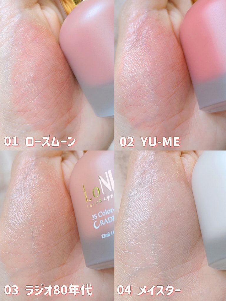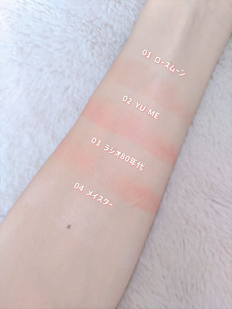 - <01 Rose Moon> 水、メチルトリメチコン、ジメチコン、エチルヘキサン酸セチル、イソノナン酸イソノニル、エタノール、ポリブテン、グリセリン、PEG-10ジメチコン、ペンチレングリコール、(ビニルジメチコン/メチコンシルセスキオキサン)クロスポリマー、1,2-ヘキサンジオール、加水分解フィブロイン、グリセリルグルコシド、ビスジグリセリルポリアシルアジペート-2、ジステアルジモニウムヘクトライト、硫酸Mg、マイカ(CI77019)、酸化チタン(CI77891)、酸化鉄(CI77491)、グンジョウ(CI77007)、赤226(CI73360)、酸化鉄(CI77492)、酸化鉄(CI77499)、BG、トリエトキシカプリリルシラン、オキシ水酸化Al、セチルPEG/PPG-10/1ジメチコン、クワ葉エキス、エチルヘキシルグリセリン、エチレンジアミンジコハク酸3Na <02 YU-ME> 水、メチルトリメチコン、ジメチコン、エチルヘキサン酸セチル、イソノナン酸イソノニル、エタノール、ポリブテン、グリセリン、PEG-10ジメチコン、ペンチレングリコール、(ビニルジメチコン/メチコンシルセスキオキサン)クロスポリマー、1,2-ヘキサンジオール、加水分解フィブロイン、グリセリルグルコシド、ビスジグリセリルポリアシルアジペート-2、ジステアルジモニウムヘクトライト、硫酸Mg、マイカ(CI77019)、赤226(CI73360)、酸化チタン(CI77891)、酸化鉄(CI77492)、酸化鉄(CI77491)、グンジョウ(CI77007)、酸化鉄(CI77499)、BG、トリエトキシカプリリルシラン、オキシ水酸化Al、セチルPEG/PPG-10/1ジメチコン、マグワ葉エキス、エチルヘキシルグリセリン、エチレンジアミンジコハク酸3Na <03 Radio 80’s > 水、メチルトリメチコン、ジメチコン、エチルヘキサン酸セチル、イソノナン酸イソノニル、エタノール、ポリブテン、グリセリルグルコシド、PEG-10ジメチコン、1,2-ヘキサンジオール、グリセリン、(ビニルジメチコン/メチコンシルセスキオキサン)クロスポリマー、ペンチレングリコール、BG、加水分解フィブロイン、ジステアルジモニウムヘクトライト、ビスジグリセリルポリアシルアジペート-2、硫酸Mg、酸化チタン(CI77891)、酸化鉄(CI77491)、酸化鉄(CI77499)、セチルPEG/PPG-10/1ジメチコン、クワ葉エキス、エチルヘキシルグリセリン、エチレンジアミンジコハク酸3Na <04 May Star> 水、メチルトリメチコン、ジメチコン、エチルヘキサン酸セチル、イソノナン酸イソノニル、エタノール、ポリブテン、グリセリルグルコシド、PEG-10ジメチコン、1,2-ヘキサンジオール、グリセリン、(ビニルジメチコン/メチコンシルセスキオキサン)クロスポリマー、ペンチレングリコール、BG、加水分解フィブロイン、ジステアルジモニウムヘクトライト、ビスジグリセリルポリアシルアジペート-2、硫酸Mg、酸化チタン(CI77891)、酸化鉄(CI77492)、酸化鉄(CI77491)、酸化鉄(CI77499)、セチルPEG/PPG-10/1ジメチコン、クワ葉エキス、エチルヘキシルグリセリン、エチレンジアミンジコハク酸3Na