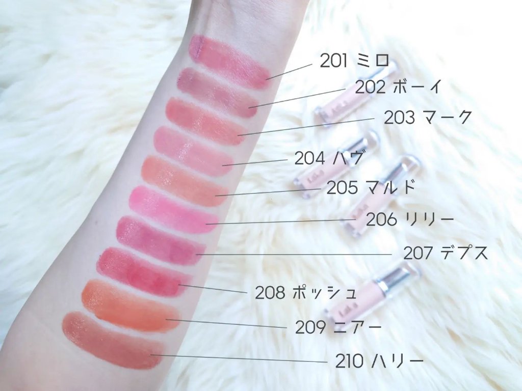 - <201 ミロ> ( アジピン酸/カプリン酸/カプリル酸/ヘプタン酸)ペンタエリスリチル、リンゴ酸ジイソステアリル、ダイマージリノール酸ダイマージリノレイルビス(ベヘニル/イソステアリル/フィトステリル)、オクチルドデカノール、合成ワックス、ポリイソブテン、トリメリト酸トリトリデシル、水添ポリイソブテン、トリイソステアリン酸ポリグリセリル-2、ジイソステアリン酸ダイマージリノレイル、マイクロクリスタリンワックス、セスキオレイン酸ソルビタン(小麦由来)、ポリヒドロキシステアリン酸、ジメチルシリル化シリカ、酢酸トコフェロール、パルミチン酸エチルヘキシル、レシチン、ミリスチン酸イソプロピル、イソステアリン酸、ジメチコン、ポリリシノレイン酸ポリグリセリル-3、デヒドロ酢酸、香料、(チタン/酸化チタン)焼結物、トコフェロール、酸化チタン、黄4、赤202、酸化鉄、橙201、紫201 <202 ボーイ> ( アジピン酸/カプリン酸/カプリル酸/ヘプタン酸)ペンタエリスリチル、リンゴ酸ジイソステアリル、ダイマージリノール酸ダイマージリノレイルビス(ベヘニル/イソステアリル/フィトステリル)、オクチルドデカノール、合成ワックス、ポリイソブテン、トリイソステアリン酸ポリグリセリル-2、トリメリト酸トリトリデシル、水添ポリイソブテン、マイクロクリスタリンワックス、ジイソステアリン酸ダイマージリノレイル、セスキオレイン酸ソルビタン(小麦由来)、ポリヒドロキシステアリン酸、ジメチルシリル化シリカ、酢酸トコフェロール、ミリスチン酸イソプロピル、イソステアリン酸、パルミチン酸エチルヘキシル、レシチン、ジメチコン、ポリリシノレイン酸ポリグリセリル-3、デヒドロ酢酸、硫酸Ba、香料、アラビアゴム、ウコン根エキス、マルトデキストリン、ロジン、トコフェロール、酸化チタン、黄4、赤201、酸化鉄、紫201、赤202、赤223 <203 マーク> ( アジピン酸/カプリン酸/カプリル酸/ヘプタン酸)ペンタエリスリチル、リンゴ酸ジイソステアリル、ダイマージリノール酸ダイマージリノレイルビス(ベヘニル/イソステアリル/フィトステリル)、オクチルドデカノール、合成ワックス、ポリイソブテン、トリメリト酸トリトリデシル、水添ポリイソブテン、トリイソステアリン酸ポリグリセリル-2、ジイソステアリン酸ダイマージリノレイル、マイクロクリスタリンワックス、セスキオレイン酸ソルビタン(小麦由来)、ポリヒドロキシステアリン酸、ジメチルシリル化シリカ、酢酸トコフェロール、硫酸Ba、パルミチン酸エチルヘキシル、レシチン、イソステアリン酸、ミリスチン酸イソプロピル、(チタン/酸化チタン)焼結物、ジメチコン、ポリリシノレイン酸ポリグリセリル-3、デヒドロ酢酸、香料、ロジン、アラビアゴム、ウコン根エキス、マルトデキストリン、トコフェロール、酸化チタン、黄4、酸化鉄、赤202、赤201、橙201、赤223 <204 ハヴ> ( アジピン酸/カプリン酸/カプリル酸/ヘプタン酸)ペンタエリスリチル、リンゴ酸ジイソステアリル、ダイマージリノール酸ダイマージリノレイルビス(ベヘニル/イソステアリル/フィトステリル)、オクチルドデカノール、合成ワックス、ポリイソブテン、トリイソステアリン酸ポリグリセリル-2、トリメリト酸トリトリデシル、水添ポリイソブテン、ジイソステアリン酸ダイマージリノレイル、マイクロクリスタリンワックス、セスキオレイン酸ソルビタン(小麦由来)、ポリヒドロキシステアリン酸、ジメチルシリル化シリカ、酢酸トコフェロール、ミリスチン酸イソプロピル、パルミチン酸エチルヘキシル、レシチン、イソステアリン酸、硫酸Ba、ジメチコン、(チタン/酸化チタン)焼結物、ポリリシノレイン酸ポリグリセリル-3、デヒドロ酢酸、香料、ロジン、トコフェロール、酸化チタン、黄4、酸化鉄、赤202、赤218 <205 マルド> ( アジピン酸/カプリン酸/カプリル酸/ヘプタン酸)ペンタエリスリチル、リンゴ酸ジイソステアリル、ダイマージリノール酸ダイマージリノレイルビス(ベヘニル/イソステアリル/フィトステリル)、オクチルドデカノール、合成ワックス、ポリイソブテン、トリメリト酸トリトリデシル、水添ポリイソブテン、トリイソステアリン酸ポリグリセリル-2、ジイソステアリン酸ダイマージリノレイル、マイクロクリスタリンワックス、セスキオレイン酸ソルビタン(小麦由来)、ポリヒドロキシステアリン酸、ジメチルシリル化シリカ、酢酸トコフェロール、パルミチン酸エチルヘキシル、イソステアリン酸、レシチン、ミリスチン酸イソプロピル、ジメチコン、ポリリシノレイン酸ポリグリセリル-3、デヒドロ酢酸、(チタン/酸化チタン)焼結物、香料、アラビアゴム、ウコン根エキス、マルトデキストリン、トコフェロール、酸化チタン、黄4、酸化鉄、赤202、赤201、橙201、赤223 <206 リリー> ( アジピン酸/カプリン酸/カプリル酸/ヘプタン酸)ペンタエリスリチル、リンゴ酸ジイソステアリル、ダイマージリノール酸ダイマージリノレイルビス(ベ