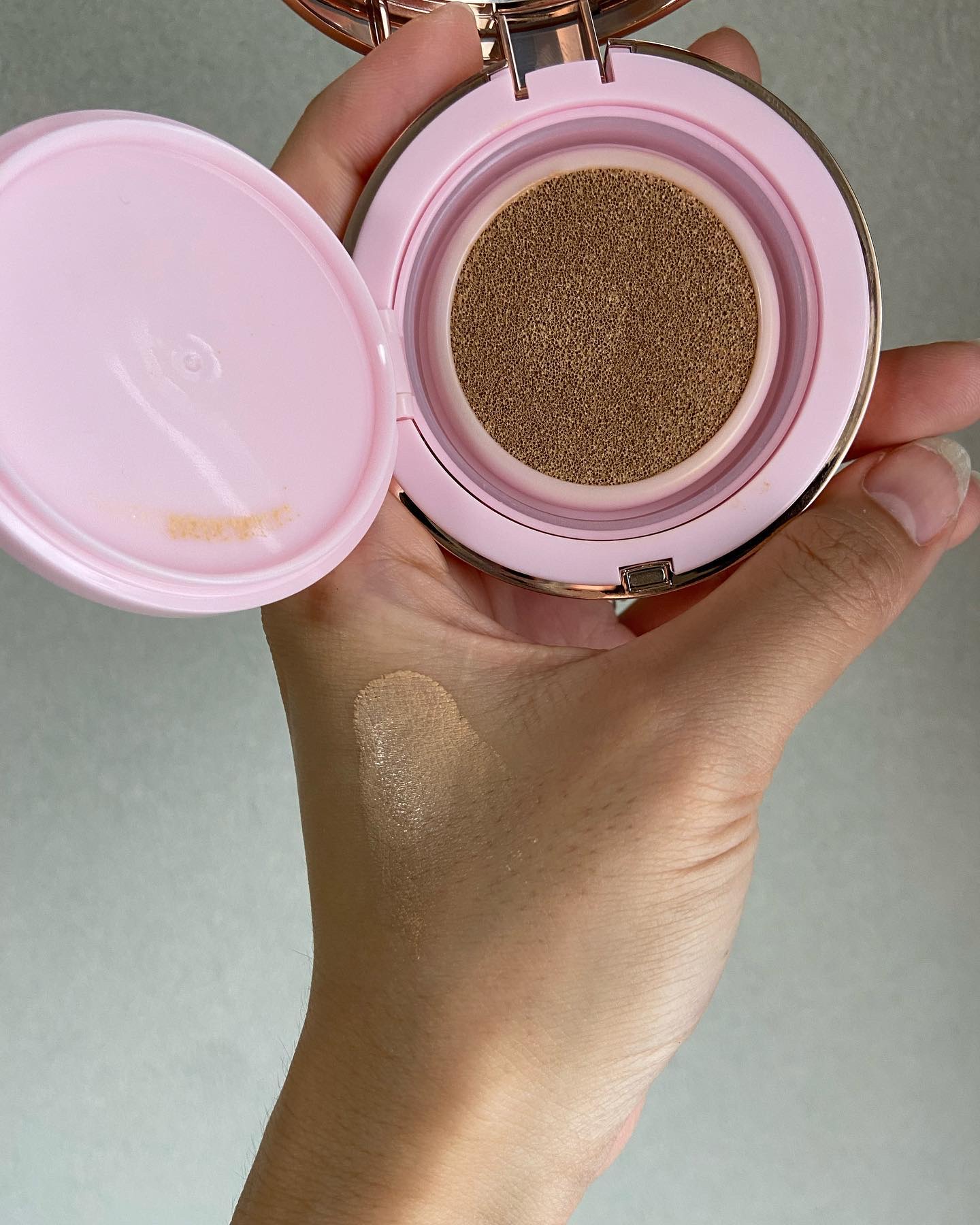 混合肌や敏感肌におすすめのピンクティーツリーカバープライマークッション カラーは『21号』を使用しました! SPF50+ PA++++の高UVカットのクッションファンデーション うるおい感がありながら、ピタッと肌に密着してくれるテクスチャ