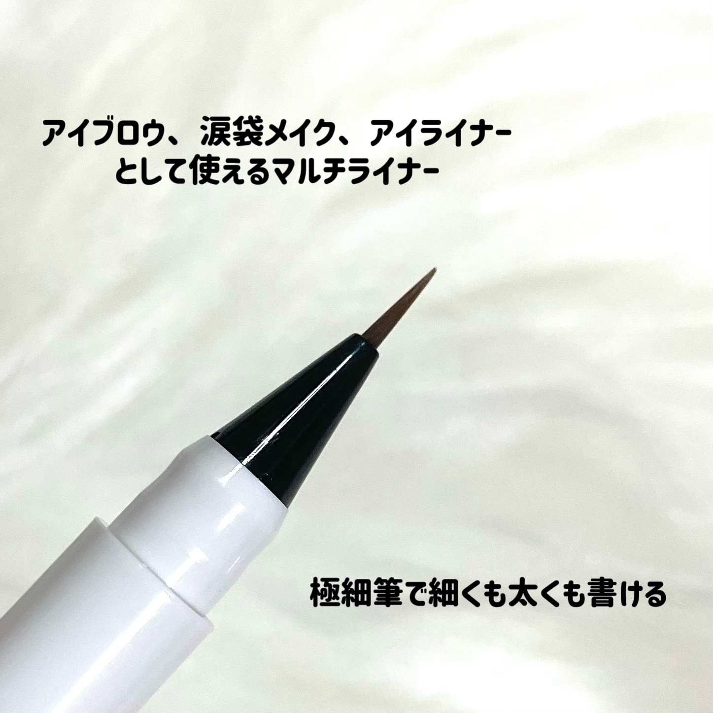 - 眉尻や涙袋などマルチに使えるニュアンスライナー ◆こっそり仕込む絶妙発色ニュアンスカラーでマルチに活躍 眉尻や涙袋の影など、肌になじんでひっそり仕込める優しいニュアンスカラー。 ・アイブロウとして…眉尻や細かい部分に描き足すことで自然に毛量UPしたような仕上がり。長時間ヨレにくくキープ。 ・涙袋の影として…涙袋の下に少しだけラインを描き、優しくぼかすことで自然な涙袋の陰影に。 ・アイライナーとして…にじみやすい目尻ラインを長時間キープ。 ※衛生上、アイライナーとしてお使いの場合は目元用としてのご使用を推奨します。 ◆描きやすい超極細筆 超極細筆を使用しているため、こだわりの描きやすさ。自由自在に、かわいいを仕込めます。 ◆汗・こすれに強く長時間しっかり密着 汗や涙、こすれに強く、理想のラインを長時間キープ。にじみにくいのに、お湯と石けんで簡単オフできます。 ※2024年6月〜「01 ブラウン」のパッケージリニューアル(色味の変更)。