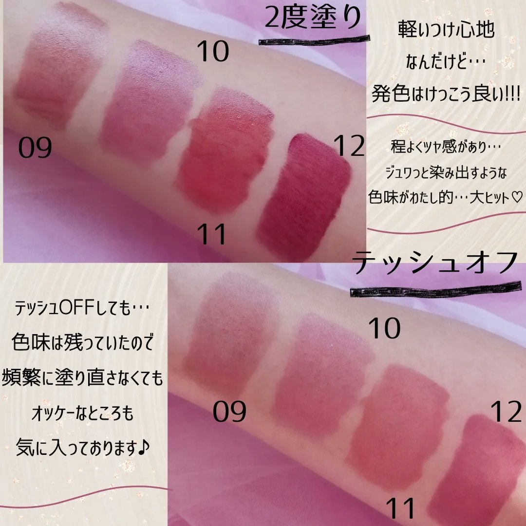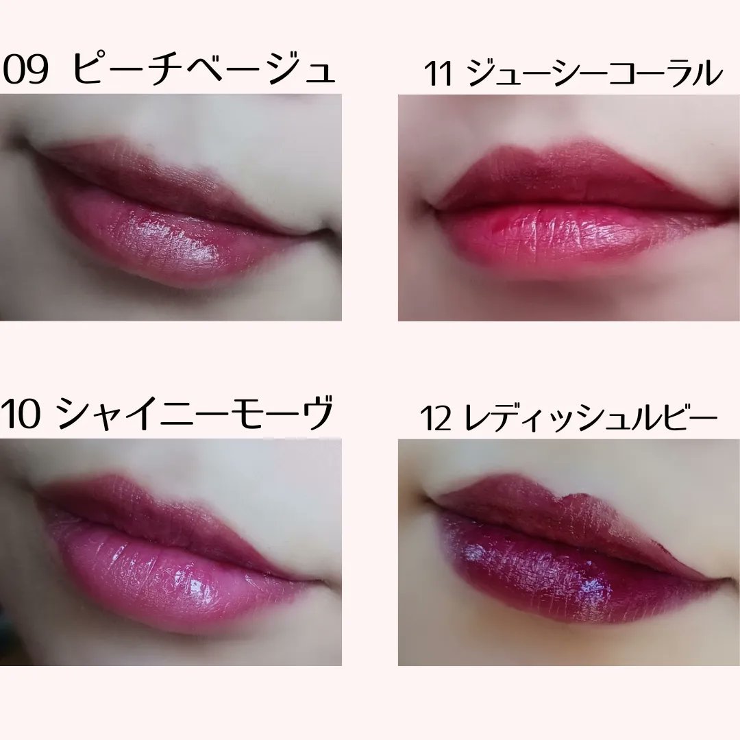 透明感のあるカラーだけど…… 発色はすごく良いっ.ᐟ.ᐟ しっかり唇を色付けたい方にも推したい♪ 時間が経過しても色が唇に残っていました.ᐟ.ᐟ 色持ちの面でもGOOD👍 色持ちが良いという事で重めのテクスチャーかと思いきや……意外にもサラッとしていて軽い付け心地.ᐟ.ᐟ 長く続くうるおい感☆˒˒ 塗ってすぐだけでなく…時間が経ってもうるおい感が残るので乾燥しやすい唇の方にも推したいです.ᐟ.ᐟ 自分のパーソナルカラーに合わせた色を選びやすいので…自分に合った色が見つかると思います.ᐟ.ᐟ