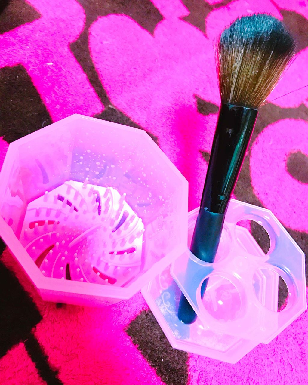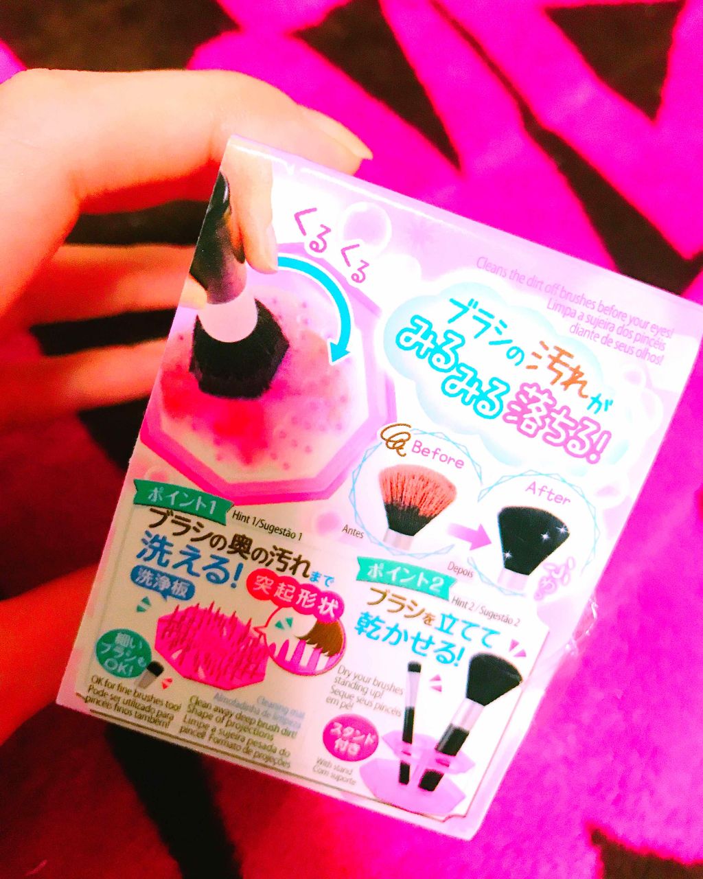 - メイクブラシの皮脂や汚れをきれいに落とします。 くるくる回すだけです。 ブラシの汚れがみるみる落ちます。 洗浄板の中央付近の小さな突起はアイブロウブラシなど毛先の短いブラシも洗えます。
