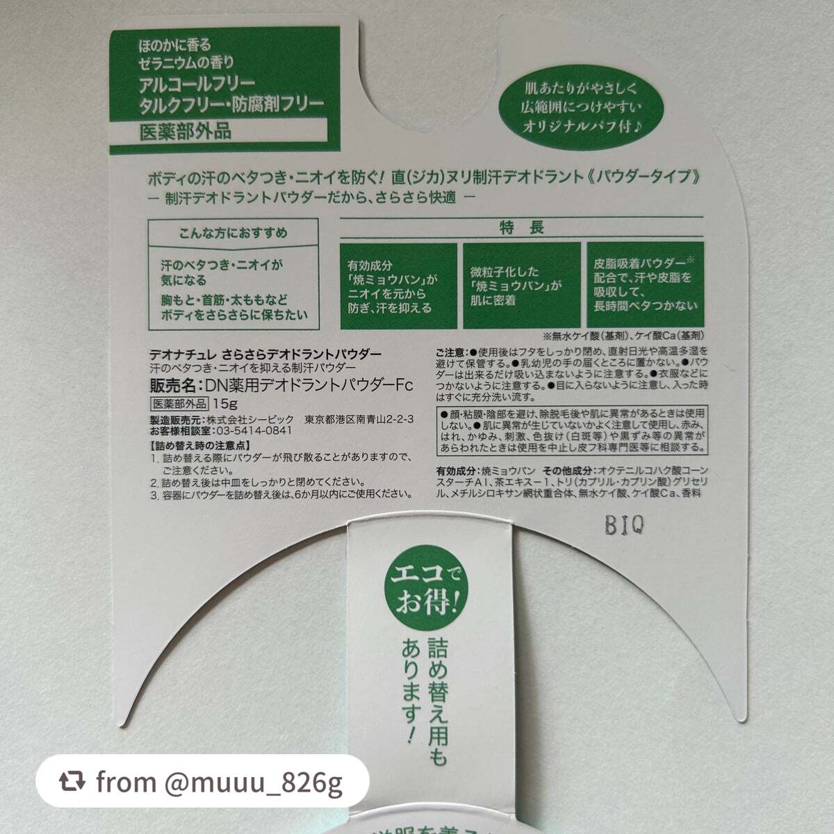 - \11年間ず~っと売上No.1*直ヌリ制汗デオドラントブランド/ 『防臭力のデオナチュレ』シリーズから、ボディ用制汗・防臭パウダー 「薬用デオナチュレ さらさらデオドラントパウダー」 ボディのベタ汗・ムレ・ニオイを防ぐ 合成香料・着色料・アルコール・タルク・防腐剤 無配合 ◆◆汗っかきさん、その胸の谷間のベタ汗は、ニオイの原因に!◆◆ ・胸の谷間、アンダーバストのベタ汗を防いで、ニオイも抑える ・首筋、太もも裏のベタつきにも ◆◆ユーザーから選ばれる理由◆◆ 1.天然アルム石に着目。有効成分「焼ミョウバン」を配合し、汗・ニオイを元から防ぐ! 「薬用デオナチュレ さらさらデオドラントパウダー」は、有効成分「焼ミョウバン」を配合 さらに、皮脂吸収さらさらパウダー**が汗や皮脂を吸収して長時間ベタつかない 2.大判パフで、“直ヌリ”で肌さらさら!さらさら感、続いちゃう! 3.つけるときに、ほんのり香る、天然ゼラニウムの香り ==注意== ●顔・粘膜・陰部を避け、除脱毛直後や肌に異常があるときは使用しないでください。●肌に異常が生じていないかよく注意してご使用ください。また、お肌に合わないとき、使用中に赤み、はれ、かゆみ、刺激、色抜け(白斑等)や黒ずみ等の異常があらわれたときは、使用を中止し、皮フ科専門医等にご相談ください。●使用後はフタをしっかり閉め、直射日光や高温多湿を避けて保管してください。●乳幼児の手の届かないところに置いてください。●パウダーは出来るだけ吸い込まないように注意してください。●衣服などにつかないようにご注意ください。●目にはいらないように注意し、入ったときはすぐに充分に洗い流してください。 【詰め替え時の注意点】 ・パウダーの飛び散りにご注意ください。 ・中皿をしっかりと閉めてください。 ・詰め替え後は、6か月以内にご使用ください。 販売名:DN薬用デオドラントパウダーFc *インテージSRI+制汗剤市場 2013年5月~2024年4月 ソフトストーンW(販売名:デオナチュレソフトストーンEX(リニューアル前処方)・DN薬用スティックFe)累計販売金額 **基剤:無水ケイ酸、基剤:ケイ酸Ca