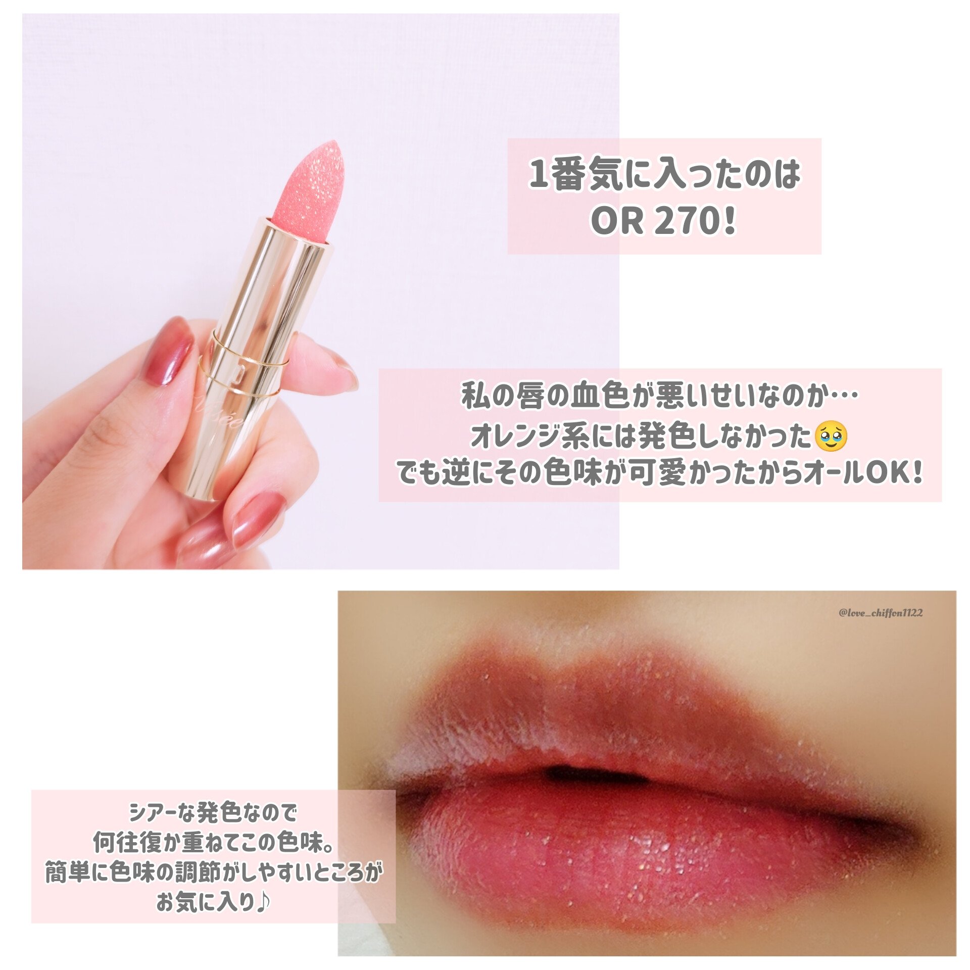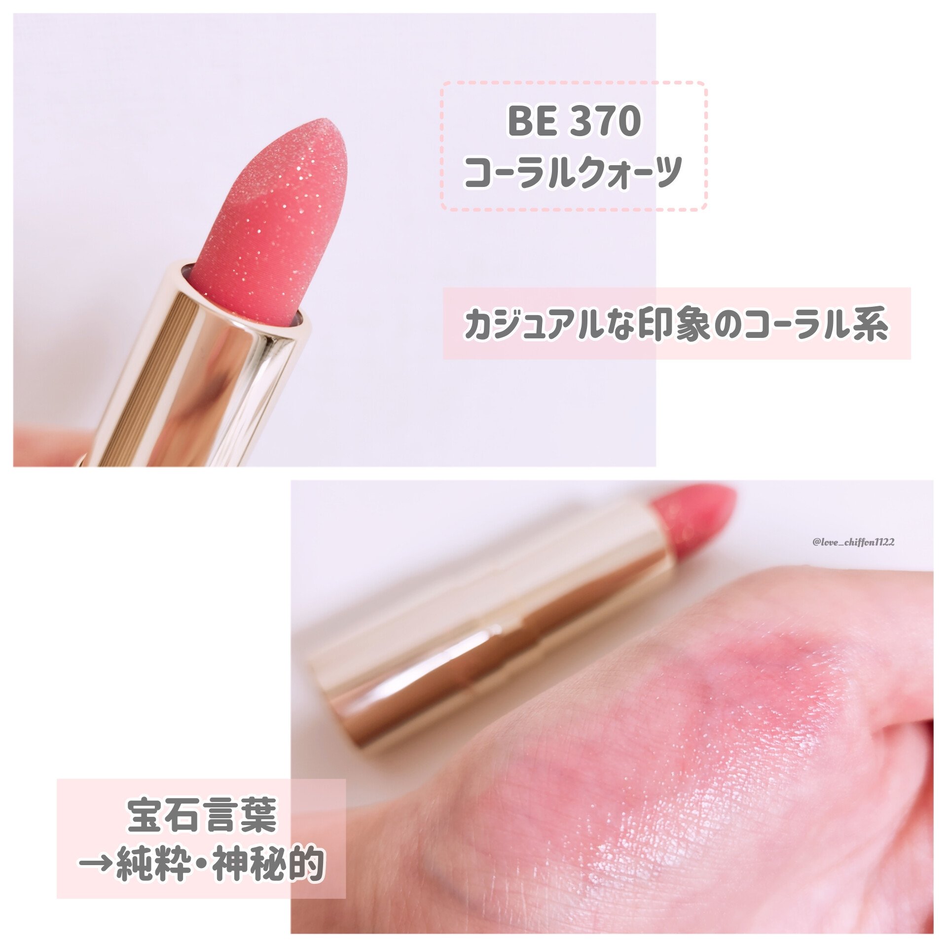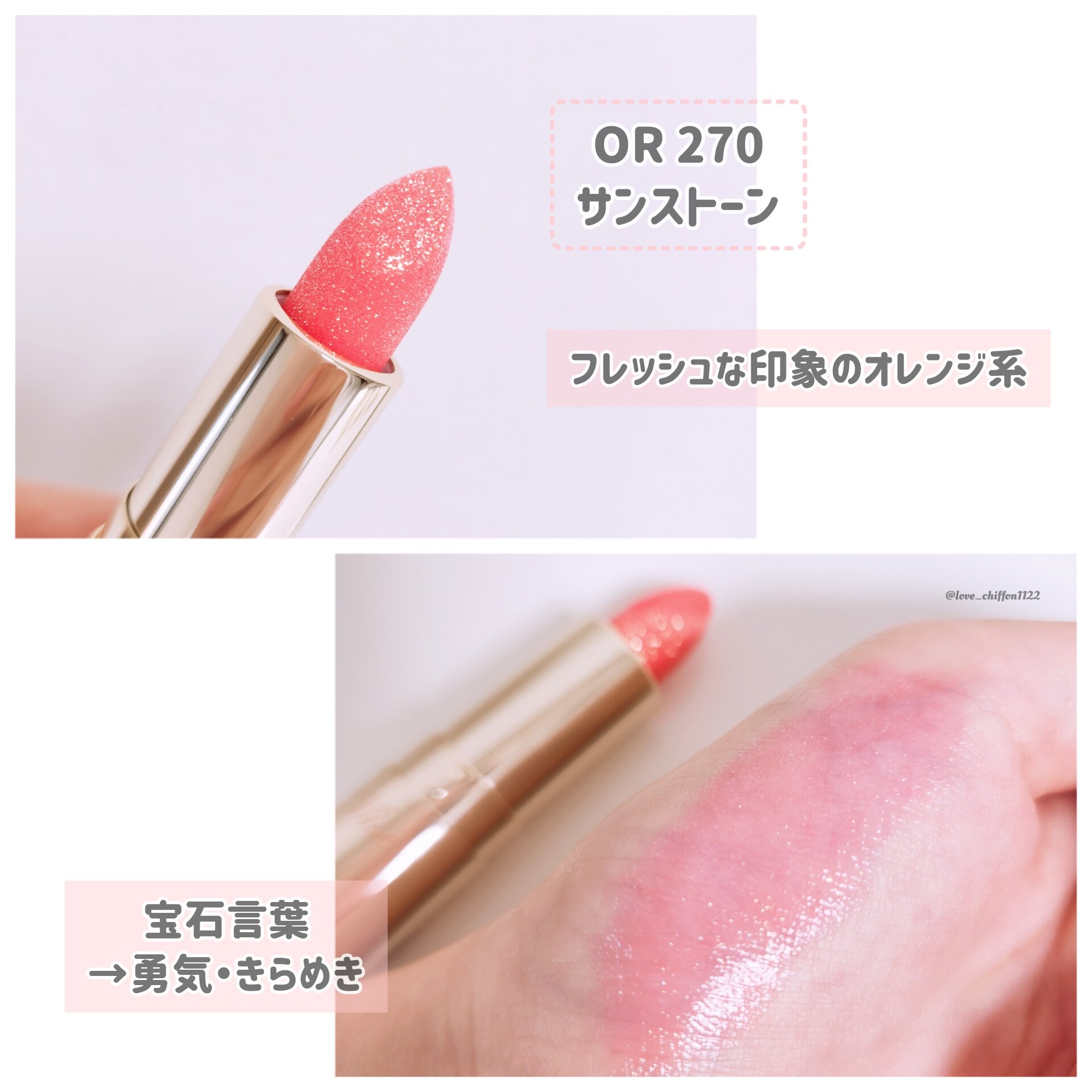 - 宝石のような輝きをまとうティントリップバーム。 唇をケアしながら、自然な血色感をプラスし、ピュアな唇へと導く。 BE370 コーラルクォーツ:カジュアルな印象のコーラル系 OR270 サンストーン:フレッシュな印象のオレンジ系 PK871 レッドルビー:キュートな印象のルビー系 PU170 モーヴアメジスト(限定色):魅惑的な印象のモーヴレッド系 RD470 ディープガーネット(限定色):熟した果実のようなレッド系