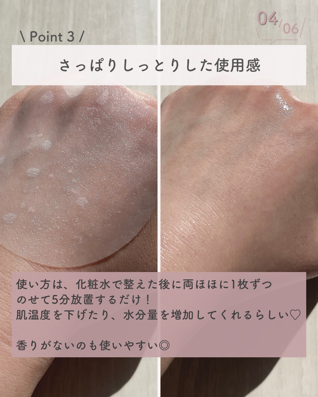 シートは薄く美容液がヒッタヒタ! たっぷり入ってる♡ シートはとっても柔らかい✨ たった3分付けるだけで完了! シートの質感がとっても好きで ヒタヒタの感じや保湿力も◎