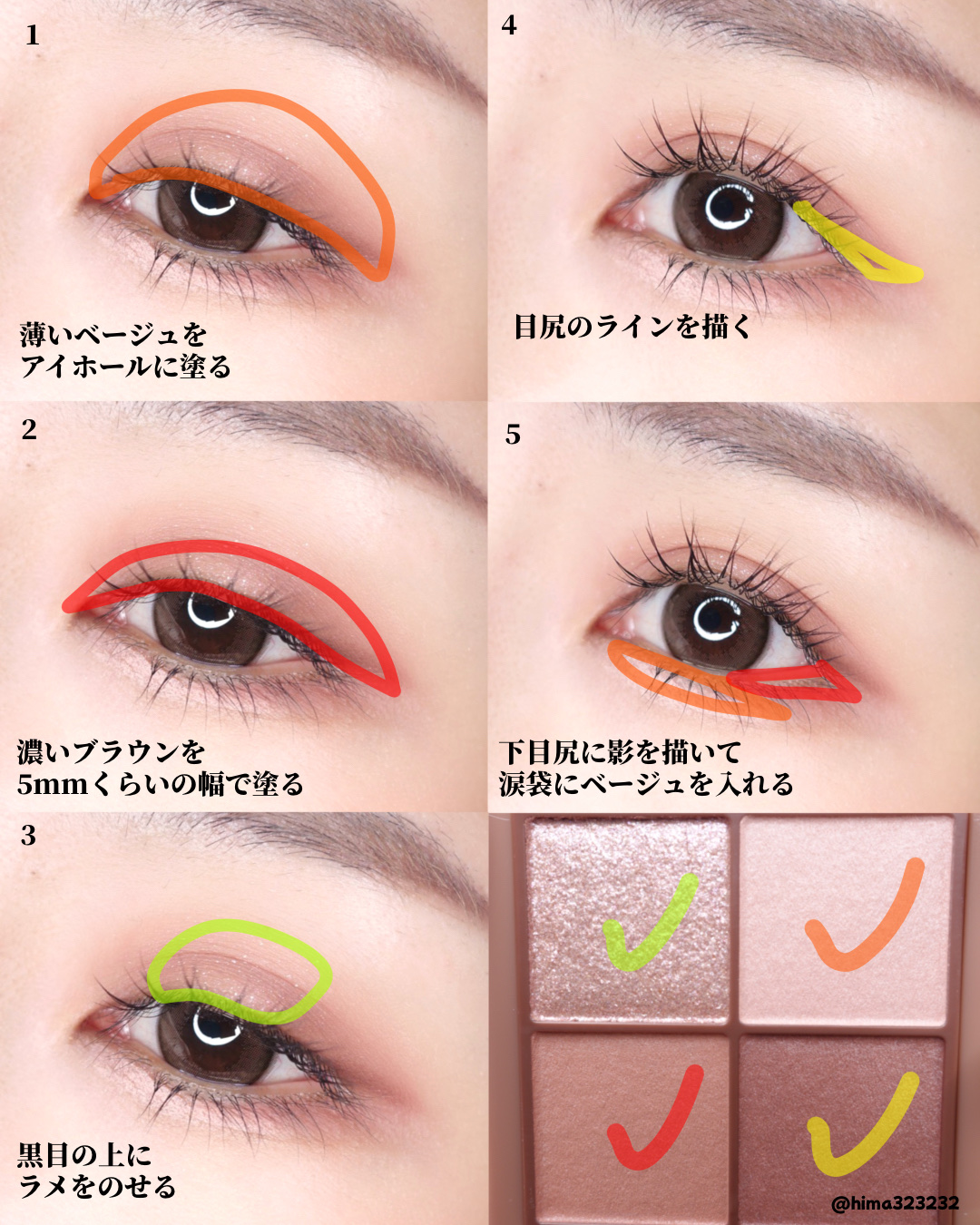 ①指でベタ塗りしない ②濃い色を広く入れすぎない ③目頭側に広く色を入れない ④下目尻は2色混ぜて使う ⑤色の境目はぼかすorラメをのせる ⑥涙袋の影は入れすぎない ⑦涙袋にラメを乗せすぎない ⑧マスカラ・グリッターはつける量を調節する ⑨マスカラのダマはコームでとかす ⑩アイラインは目尻だけ
