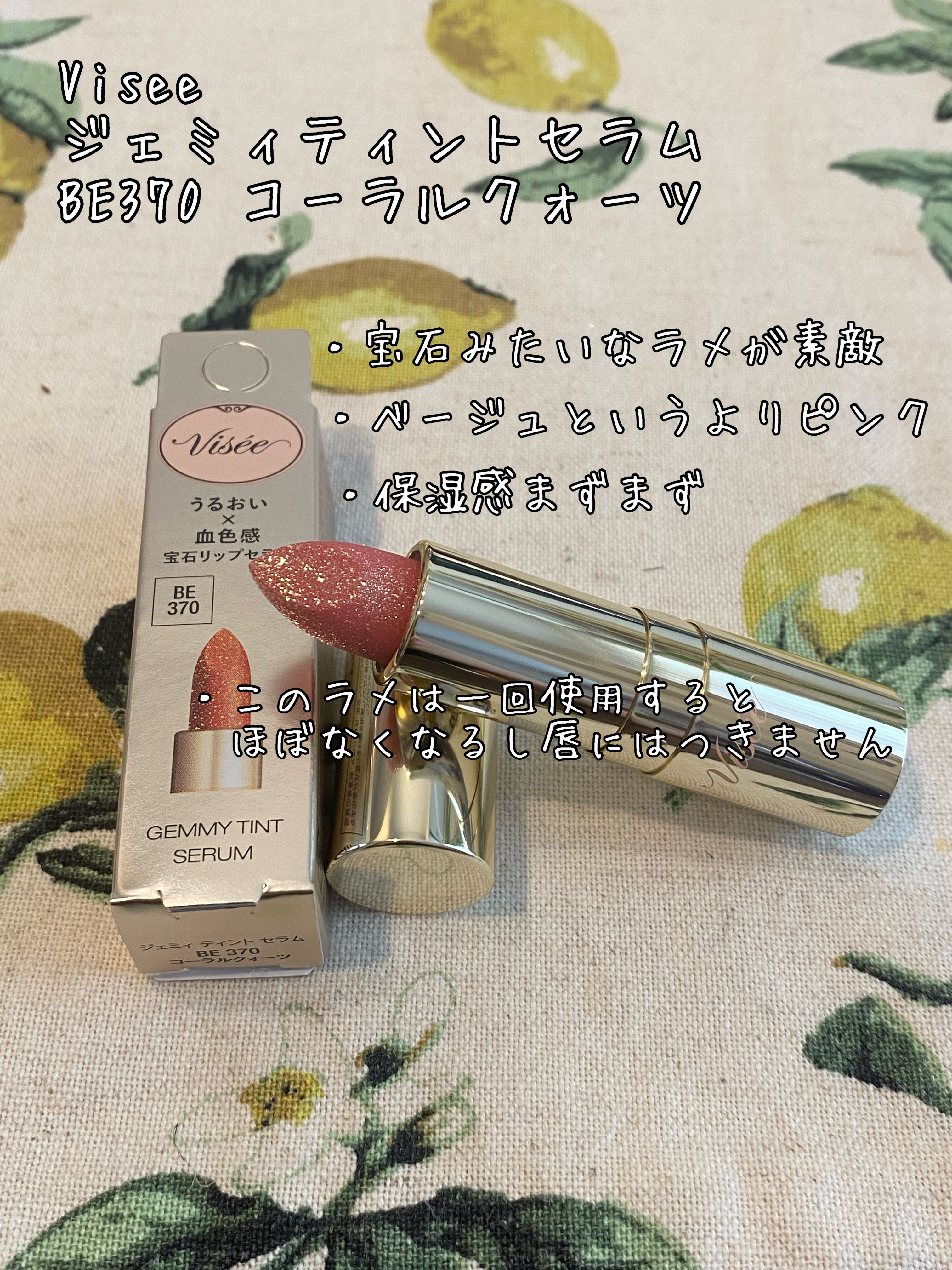 【色味】205マルド公式サイトの画像だとレッドブラウンなのに塗ったらコーラルピンク…。色味全然違うね?!可愛いけど、あまりにも違うね?!とがっかりしました🥲 212 パパイアこちらも公式サイトの画像とだいぶ違う色に発色しました。マルドみたいに色の系統自体違う!とまではいきませんが、私の場合同じLakaのフルーティーグラムティントのシュガーと同じような少し白っぽいブラウンベージュになりました。公式サイト画像だと結構しっかりブラウンなんだけどなー… 【質感】じゅわっとしたツヤが出るしスルスルっと塗りやすい 【保湿】これ一本で塗っても乾燥感はありません 【良いところ】ささっと塗りやすいところパケがなんとなく可愛いところ香りが穏やかなところ 【イマイチなところ】公式サイトの画像と実際の色が違う
