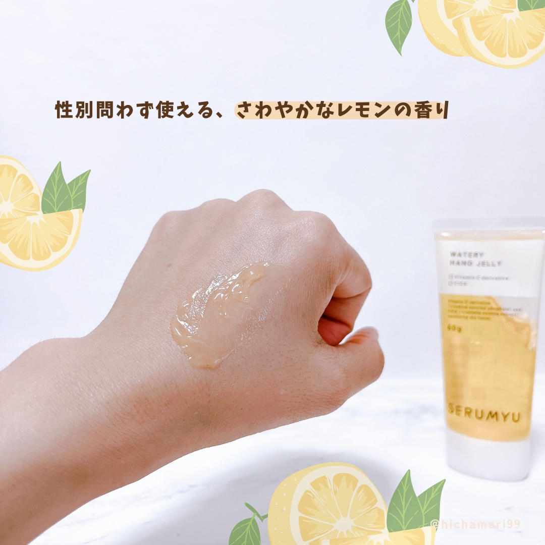 - 指先までうるおうのにベタつかない【水感ハンドジェリー】。すぐにスマホやPC作業ができてストレスフリー♪水分が浸透*1しやすい設計で美容液成分が乾いた手肌にすーっと浸透*1。うるおいながらベタつかない使用感を実現した新感覚のジェルタイプ。オイルフリーで肌の上に油膜がつくられないため、重ね塗りしても水分がぐんぐん角質層まで浸透します。美容液成分99.5%配合*2、ビタミンC誘導体*3・CICA*4配合。リフレッシュできるレモンの香り。*1角質層まで*2精製水を含みます*3アスコルビルリン酸ナトリウム(保湿成分)*4ツボクサエキス(保湿成分)