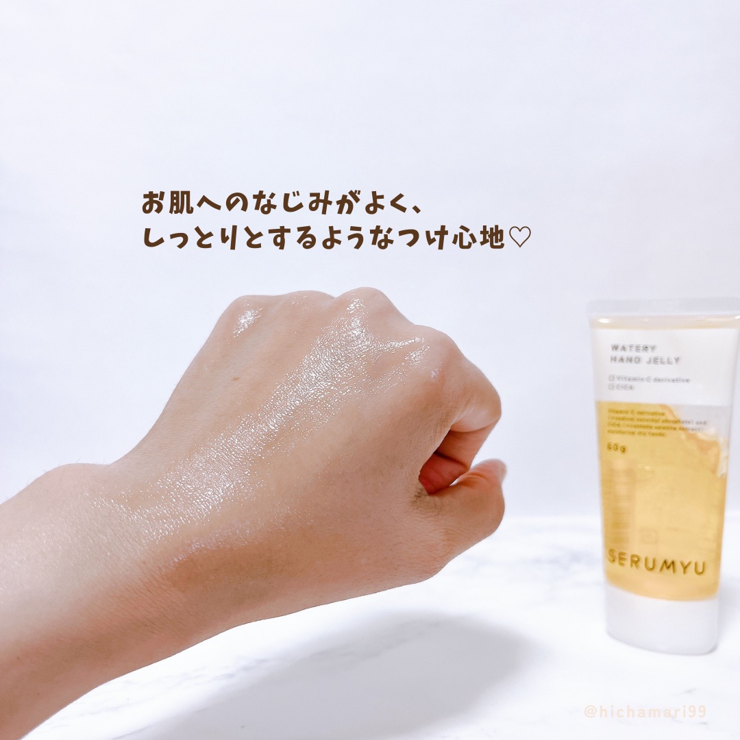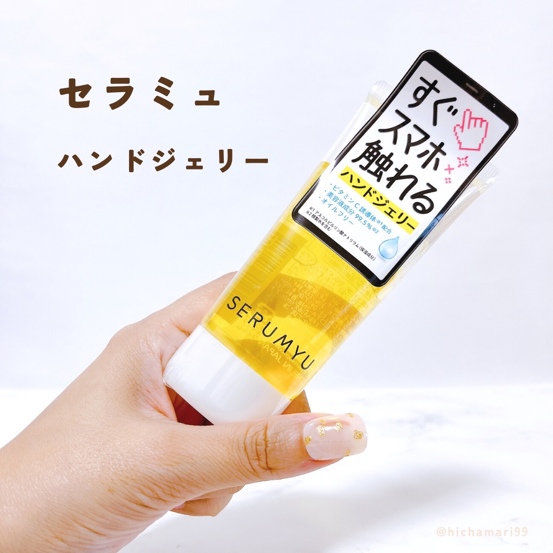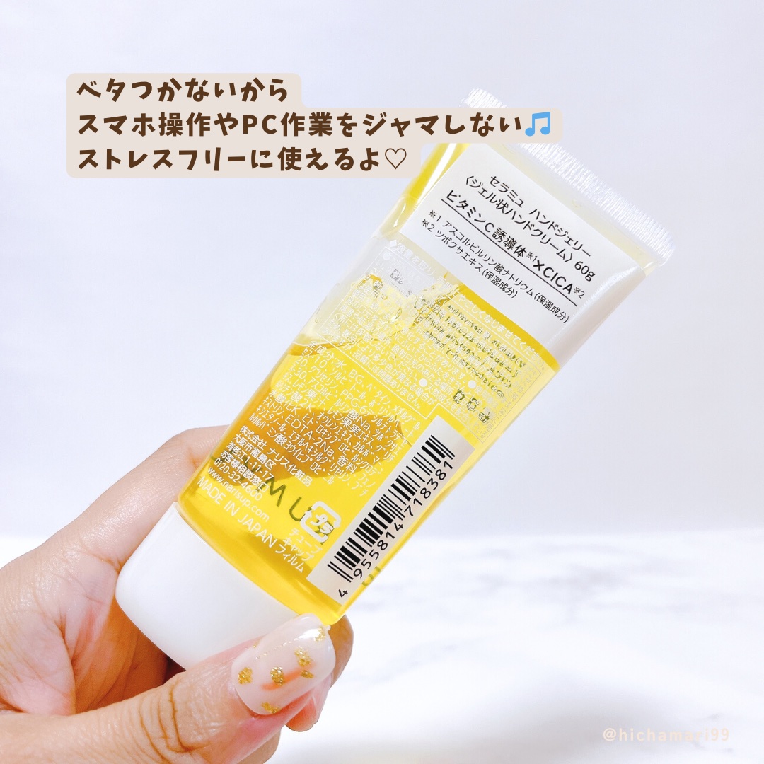 ストレスフリーなハンドケアアイテム! "セラミュ ハンドジェリー" 使ってみました。 美容成分 99.5%※1 ビタミンC誘導体※2 CICA※3 みずみずしいジェルで、しっとりしてベタつかない。 付けた後さらりとするので、スマホに付かず、ストレスフリー。