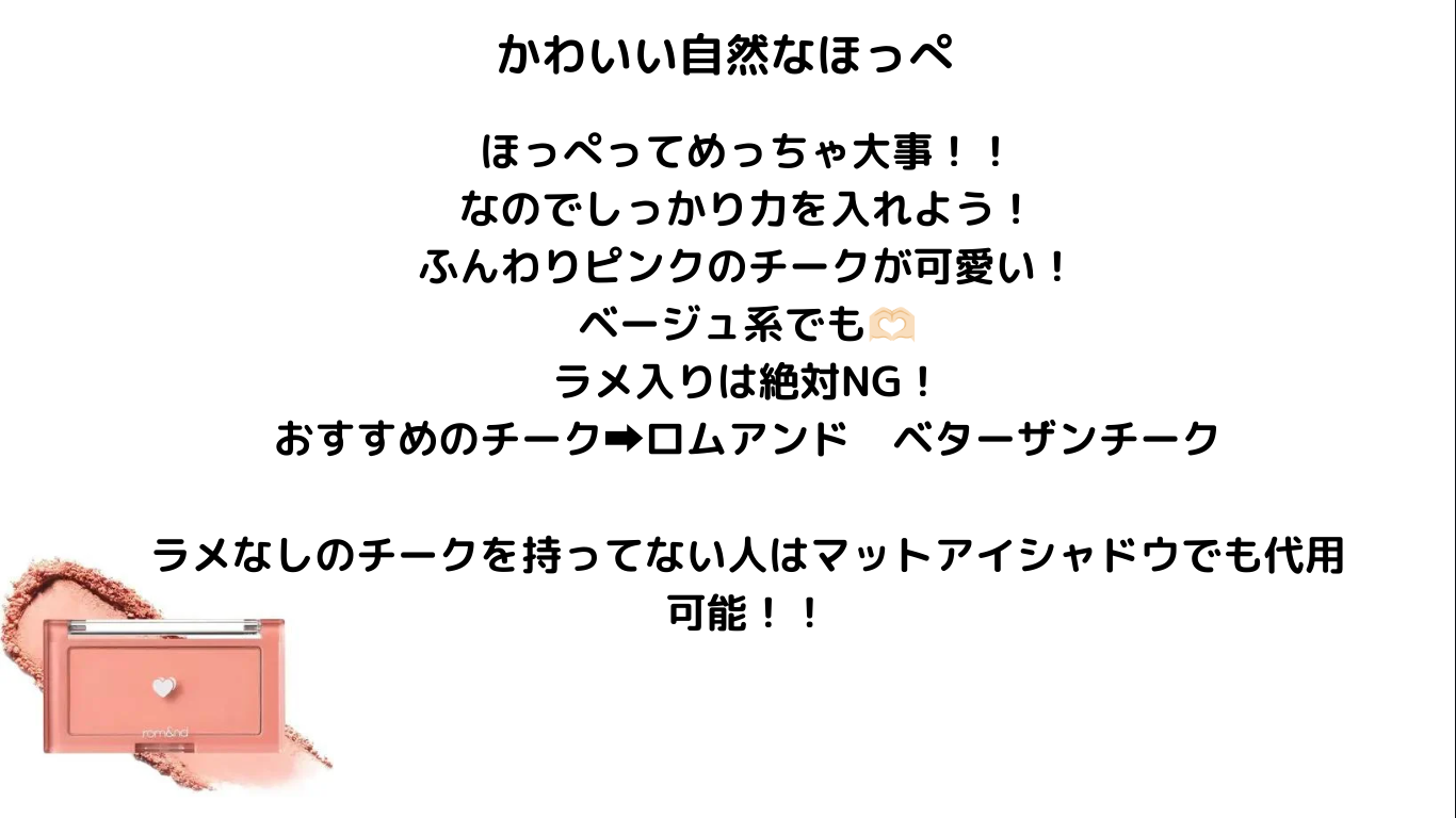 1.薄いピンク、ベージュ系のアイシャドウをアイホール全体に軽くのっける 2.目尻らへんにピンクのアイシャドウと赤のアイシャドウでグラデーションをする 3.アイラインを少し長めに描く 4.地雷ラインをアイラインと平行に描く,そしたら二重延長ラインを引く 5.三角ゾーンに軽くピンクを入れて、目を強い印象にしないようにする 6.黒目の上と目尻らへんにラメを置く(ピンク系のラメ) 7.チークはエラの部分、鼻先の部分、顎先の部分に軽く乗っける 8.シェーディングはチークをしたとこの少し下らへんにして、顔を小さく見せるためにおでこのあたりにもする、ノーズシャドウは最低限でオッケー!!👍🏻