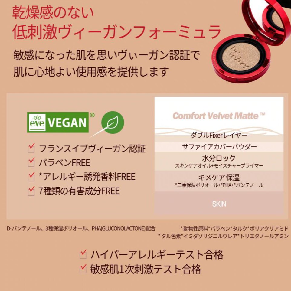 - <20 バニラ> 酸化亜鉛、水、酸化チタン、BG、グリセリン、ジメチコン、香料、水酸化Al、酸化鉄、メトキシケイヒ酸エチルヘキシル、アルミナ、ステアリン酸、プロパンジオール、カプリリルグリコール、トリエトキシカプリリルシラン、イソドデカン、シクロペンタシロキサン、ジステアルジモニウムヘクトライト、PEG/PPG-18/18ジメチコン、カプリル酸グリセリル、パンテノール、PEG-10ジメチコン、1,2-ヘキサンジオール、EDTA-2Na、BHT、塩化Na、ポリシリコーン-11、ポリメタクリル酸メチル、コメヌカロウ、変性アルコール、(ビニルジメチコン/メチコンシルセスキオキサン)クロスポリマー、グルコノラクトン、セバシン酸ジイソプロピル、(アクリレーツ/ジメチコン)コポリマー、(アクリレーツ/メタクリル酸ポリトリメチルシロキシ)コポリマー、(アクリレーツ/アクリル酸エチルヘキシル/メタクリル酸ジメチコン)コポリマー、ナイロン-6/12 <23 ベージュ> 酸化亜鉛、水、酸化チタン、BG、グリセリン、ジメチコン、香料、水酸化Al、酸化鉄、メトキシケイヒ酸エチルヘキシル、アルミナ、ステアリン酸、プロパンジオール、カプリリルグリコール、トリエトキシカプリリルシラン、イソドデカン、シクロペンタシロキサン、ジステアルジモニウムヘクトライト、PEG/PPG-18/18ジメチコン、カプリル酸グリセリル、パンテノール、PEG-10ジメチコン、1,2-ヘキサンジオール、EDTA-2Na、BHT、塩化Na、ポリシリコーン-11、ポリメタクリル酸メチル、コメヌカロウ、変性アルコール、(ビニルジメチコン/メチコンシルセスキオキサン)クロスポリマー、グルコノラクトン、セバシン酸ジイソプロピル、(アクリレーツ/ジメチコン)コポリマー、(アクリレーツ/メタクリル酸ポリトリメチルシロキシ)コポリマー、(アクリレーツ/アクリル酸エチルヘキシル/メタクリル酸ジメチコン)コポリマー、ナイロン-6/12