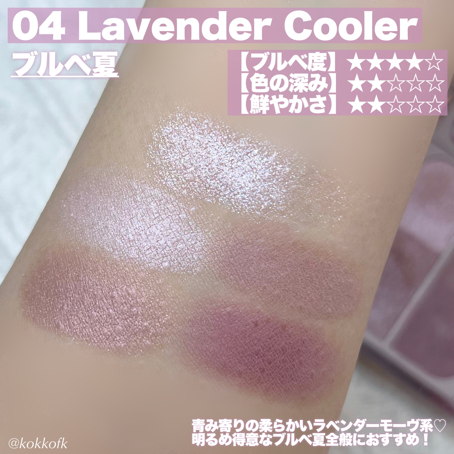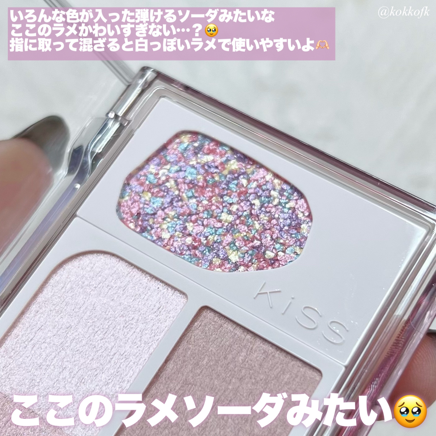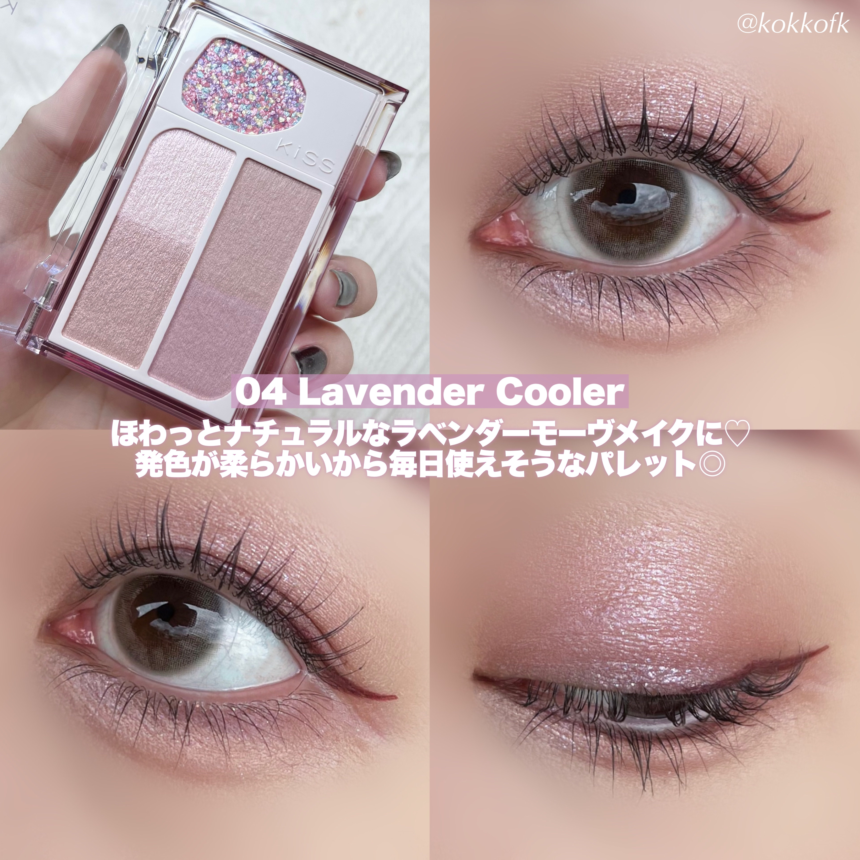 ブランド:KiSSキス品名:カクテルデイズ色:04ラベンダークーラー価格(税込み):2,090円・全ベ対応・しっとりテクスチャー・高密着処方・アルガンオイル配合(うるおい成分)粉質がしっとりしていて、ラメ落ちなどもありませんでした。🤩👏濃い発...