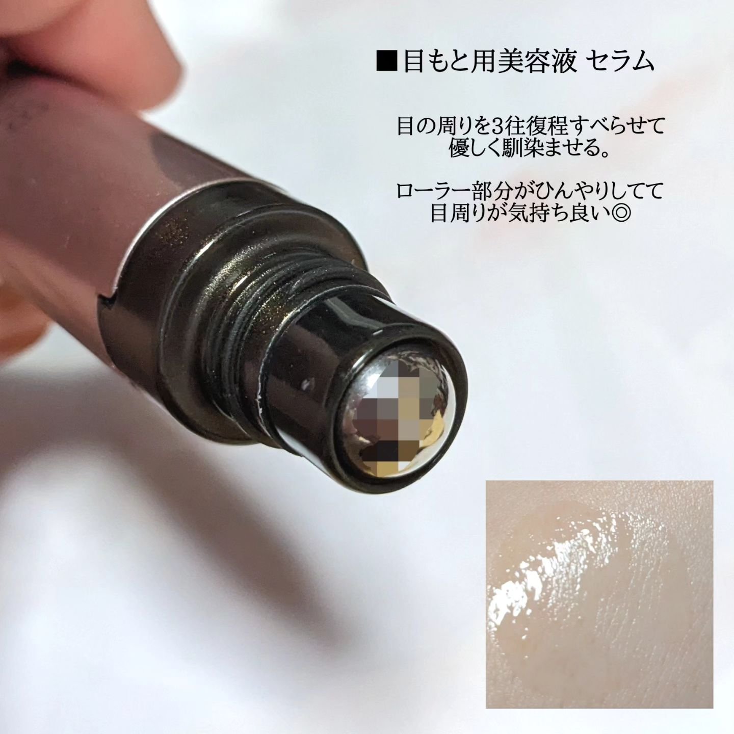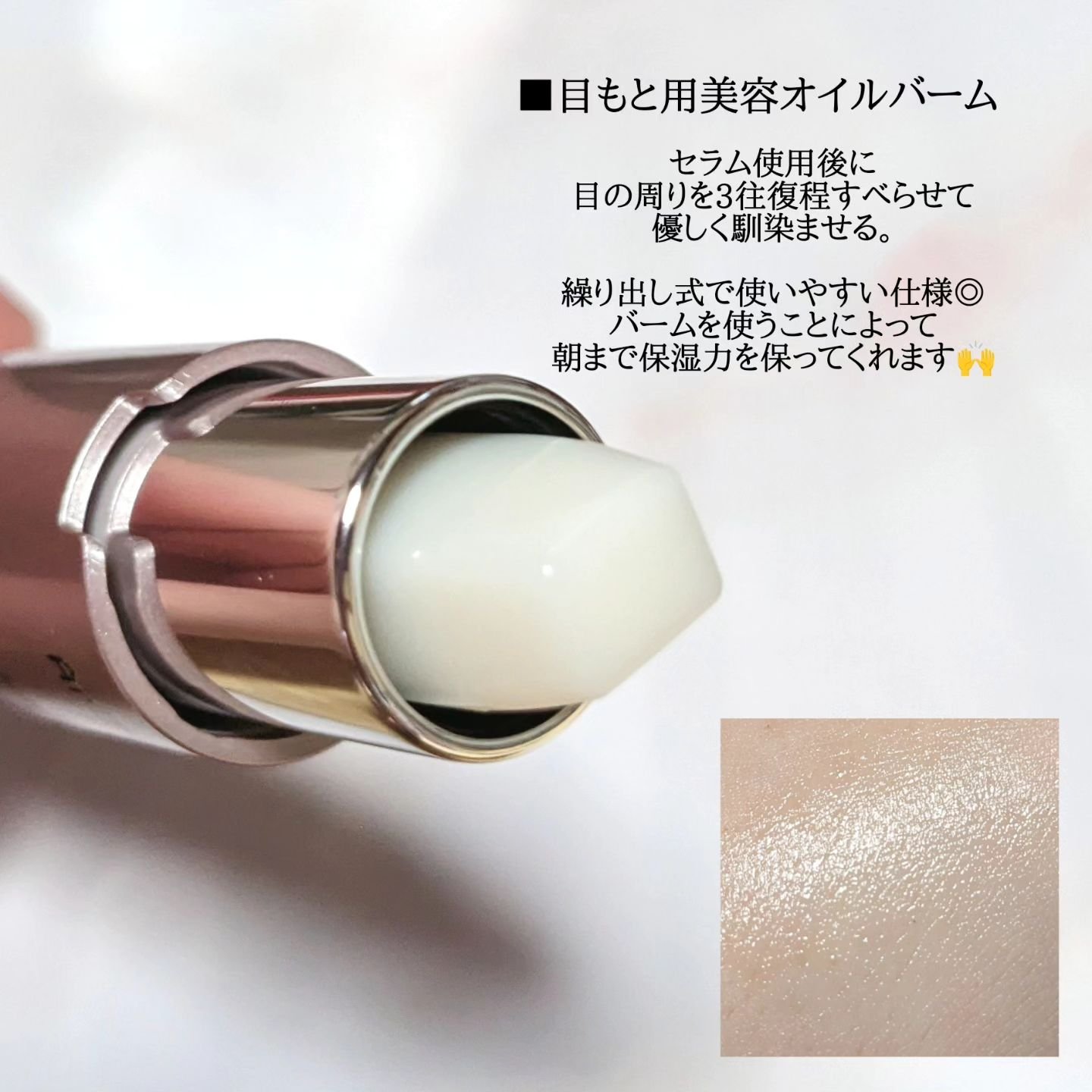 複合的な目もと悩みにアプローチするために、第一三共ヘルスケアが開発✦* セラムとバーム”2in1”スティックで艶めくハリ感を目もとに! セラムとバームの2ステップで完成する「シールドベール」 セラムとバームが重なることで、肌表面にツヤのある被膜「シールドベール」を形成。 セラムはとろみのあるテクスチャーです。 コロコロするだけで、ひんやり気持ち良い◎ スッキリとします✦*