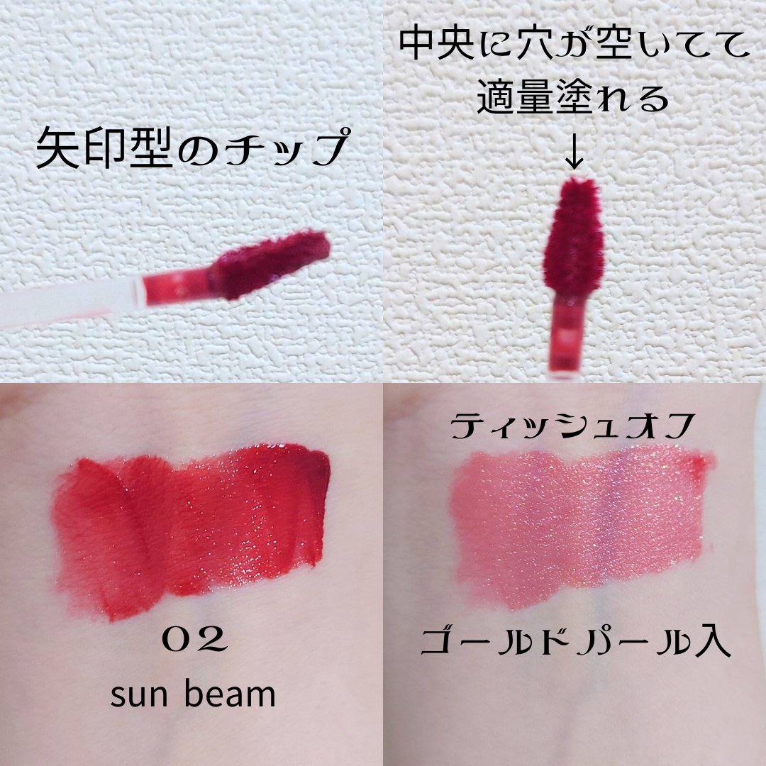 - 軽いオイルテクスチャーでべたつかず色移りが少ない、照り輝くパールコーティングティント。 グリッターパールがぶっくりした唇を、ローズヒップオイルやオリーブオイルやアボカドオイルなどがうるっとした唇を演出。