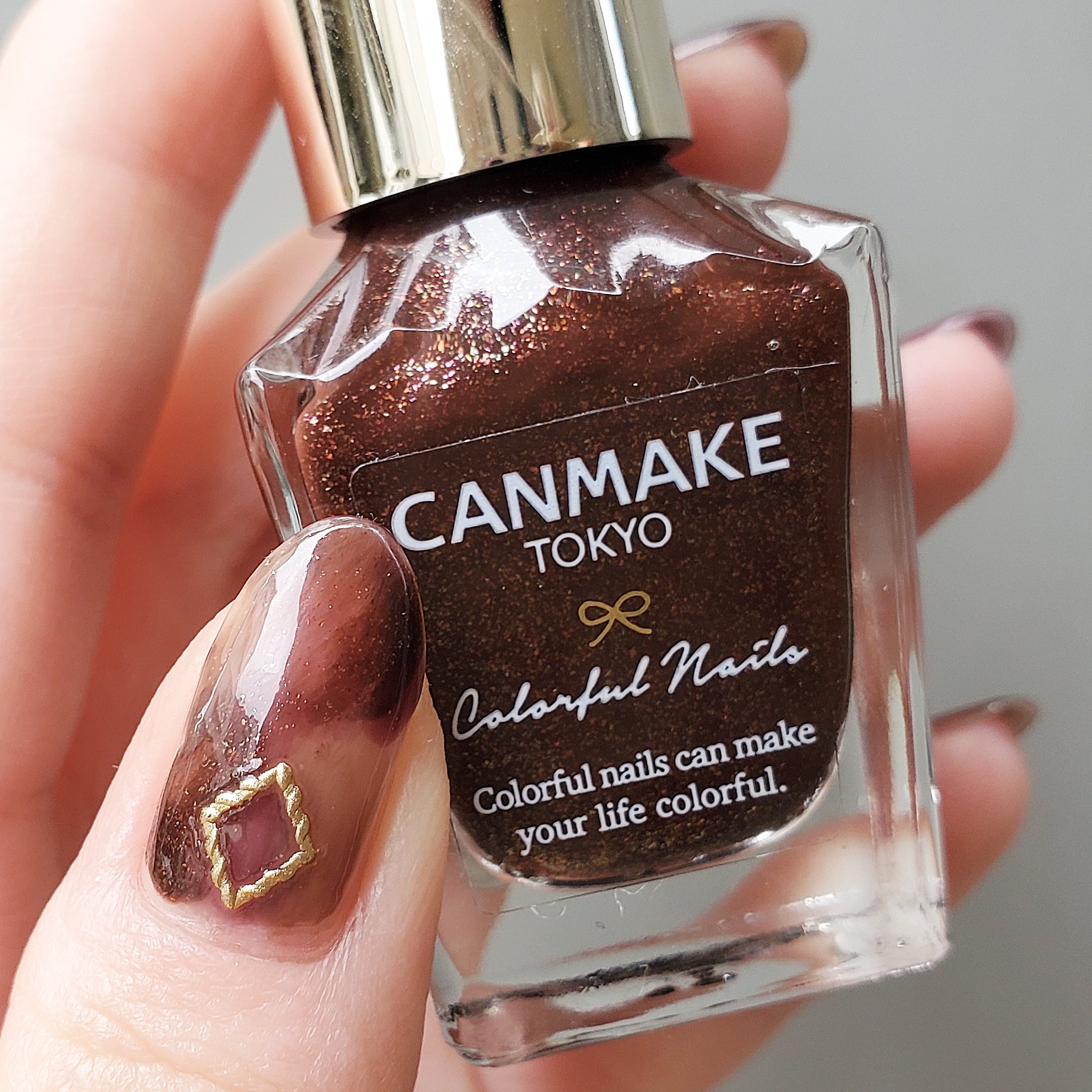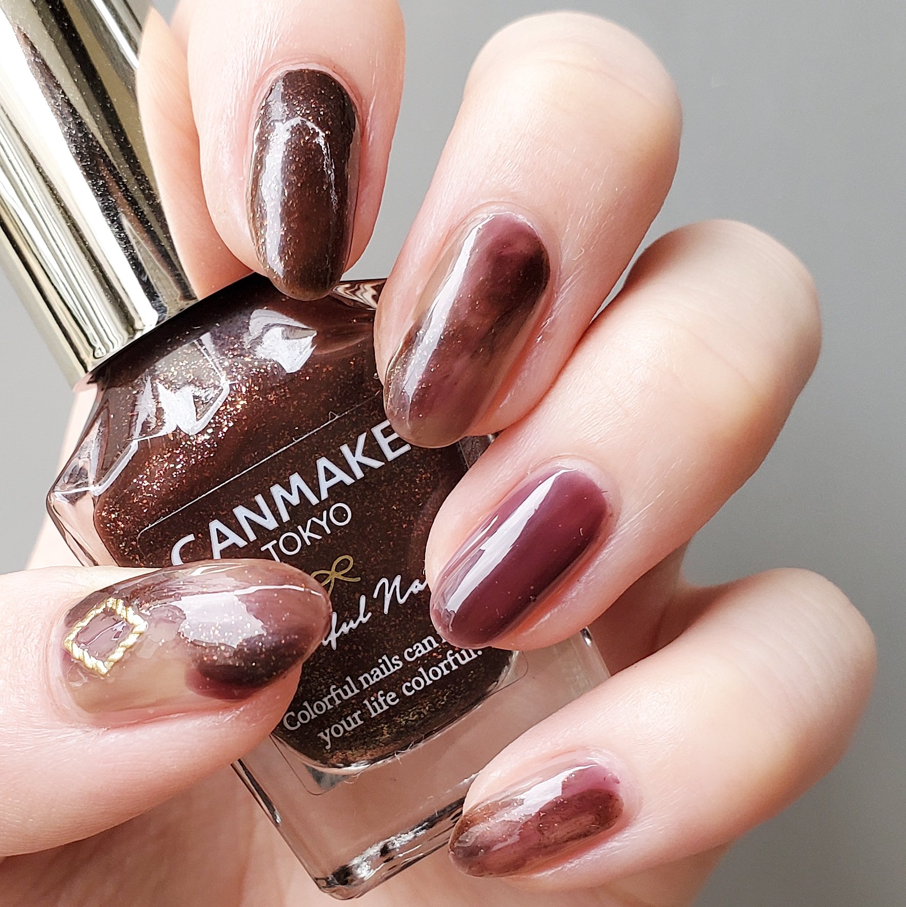 初心者さんも簡単にできる👌🏻✨ 秋っぽ天然石ネイル🤎ྀི 秋にぴったりなチョコレートオパールをイメージしました🙌🏻 キャンメイク カラフルネイルズ ¥396 〚N24 トゥインクルドロップ〛 〚N72 マロングラッセ〛