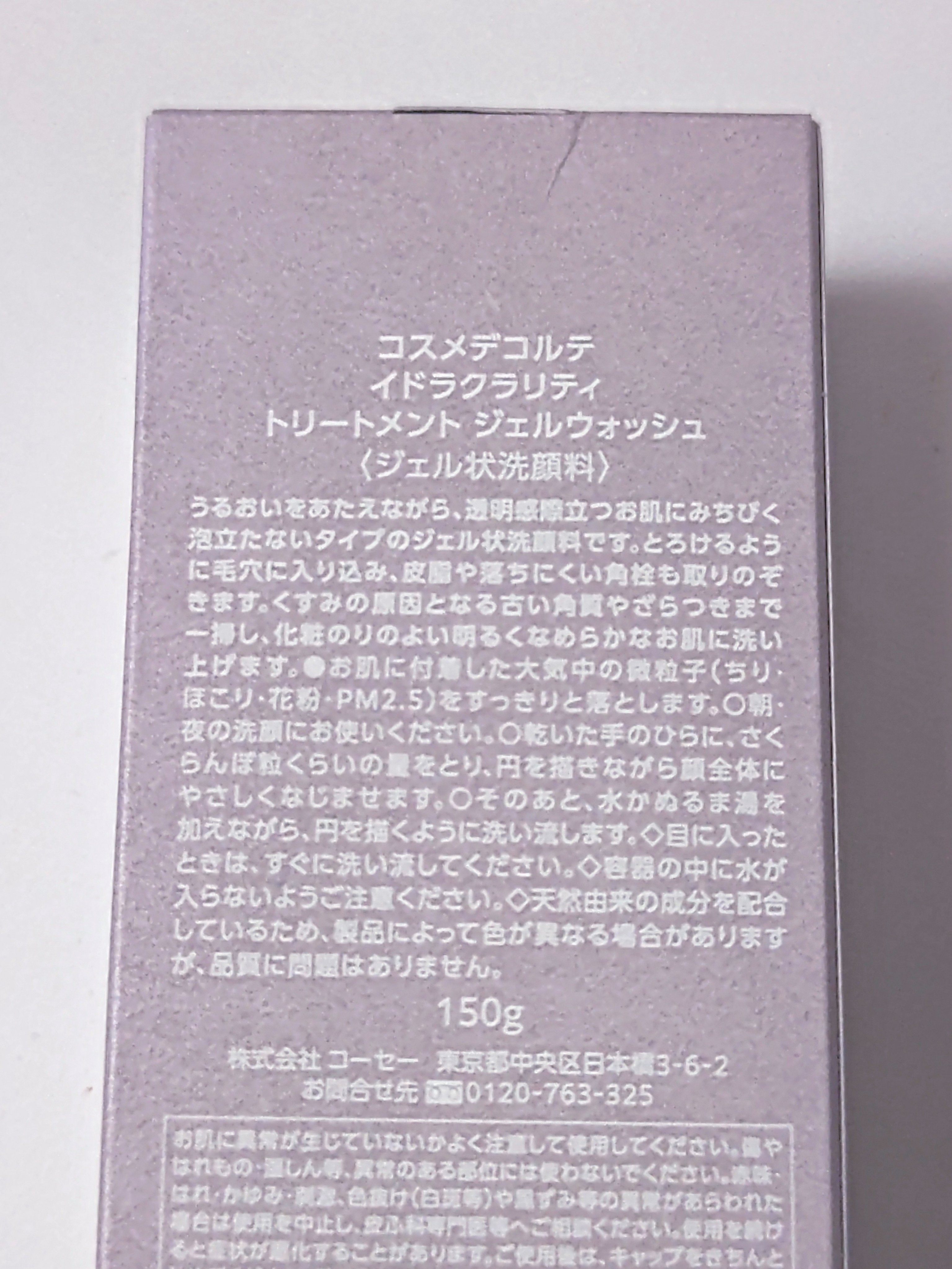 - <イドラクラリティ トリートメント ジェルウォッシュ> 水、BG、グリセリン、ジグリセリン、フェノキシエタノール、香料、トコフェロール、チャ葉エキス、エタノール、セイヨウハッカ葉エキス、チョウジエキス、DPG、プルーン分解物、TEA、水添レシチン、クエン酸、ココイルメチルタウリンNa、ヒアルロン酸ヒドロキシプロピルトリモニウム、乳酸桿菌/セイヨウナシ果汁発酵液、異性化糖、フィトステロールズ、EDTA-2Na、(アクリレーツ/アクリル酸アルキル(C10-30))クロスポリマー、クエン酸Na、ヨモギ葉エキス、オレイン酸エチル、PPG-6デシルテトラデセス-20、レイシエキス