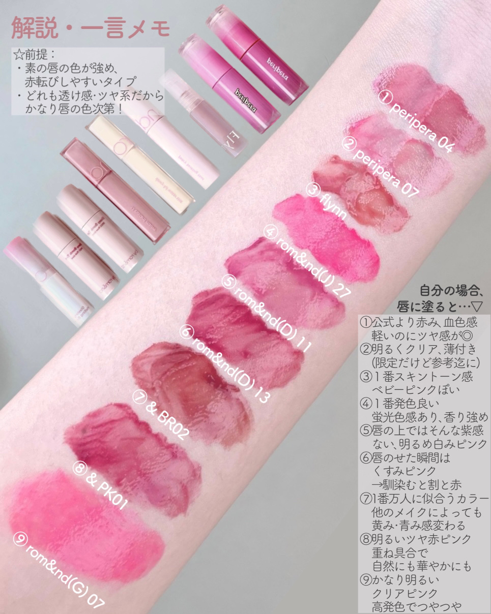 ブルベ夏おすすめカラー🎀 rom&nd ❤︎ ジューシーラスティングティント #06 FIGFIG ¥1,320(税込) デュイフルウォーターティント 06 thulian ¥1,320(税込) グラッシーボムティント BR02 ローズビーン ¥780(税込)