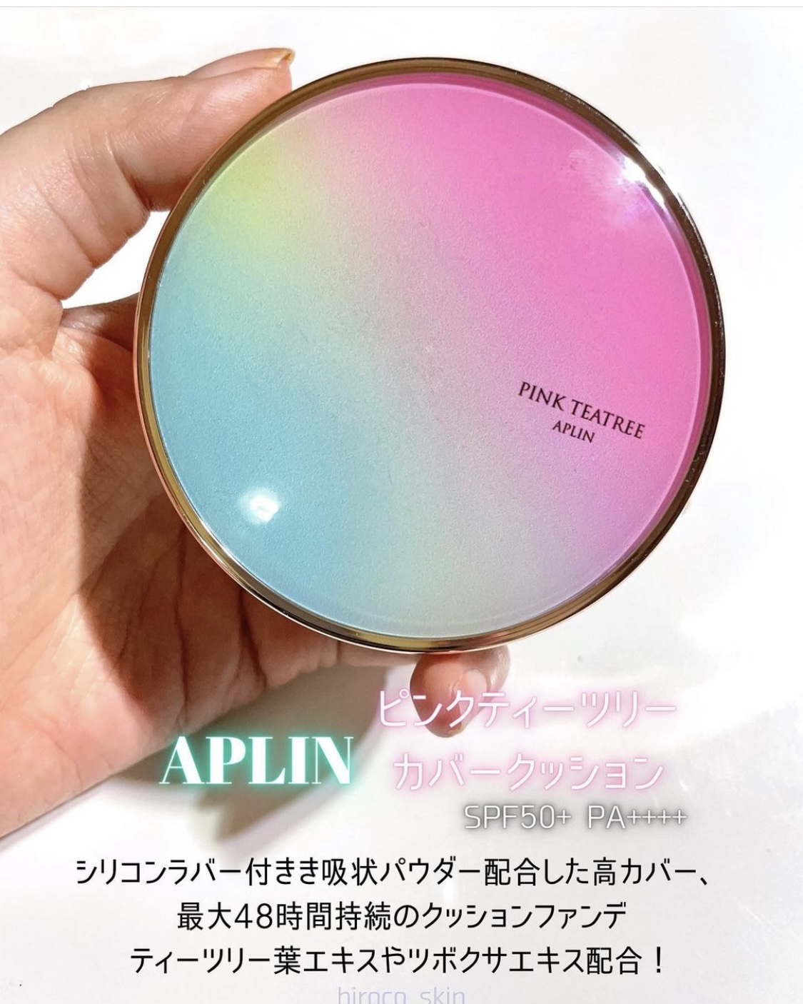APLIN ピンクティーツリーカバークッション 21号ライトベージュ 2,490円(税込) 少量でよく伸びてハイカバー! 赤みやくすみをしっかりカバ一できるのに、厚塗り感のないなめらかな仕上がり♡ ハイカバーなのにナチュラルなツヤ感とサラッとしつつ、乾燥崩れしにくい仕上がりに感動します!!