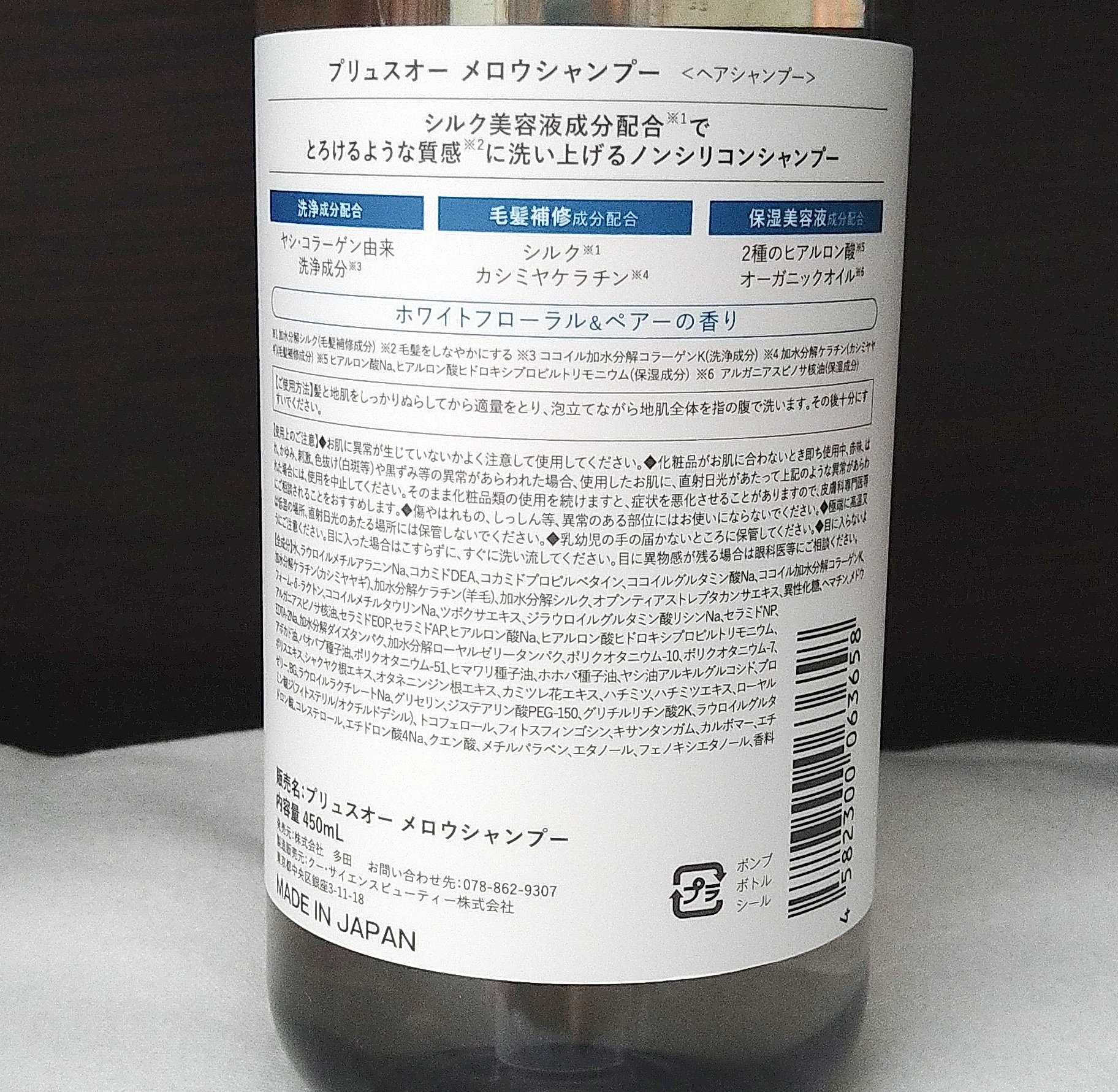 - <シャンプー 450ml> 水、ラウロイルメチルアラニンNa、コカミドDEA、コカミドプロピルベタイン、ココイルグルタミン酸Na、ココイル加水分解コラーゲンK、加水分解ケラチン(カシミヤヤギ)、加水分解ケラチン(羊毛)、加水分解シルク、オプンティアストレプタカンサエキス、異性化糖、ヘマチン、メドウフォーム-δ-ラクトン、ココイルメチルタウリンNa、ツボクサエキス、ジラウロイルグルタミン酸リシンNa、セラミドNP、アルガニアスピノサ核油、セラミドEOP、セラミドAP、ヒアルロン酸Na、ヒアルロン酸ヒドロキシプロピルトリモニウム、EDTA-2Na、加水分解ダイズタンパク、加水分解ローヤルゼリータンパク、ポリクオタニウム-10、ポリクオタニウム-7、アボカド油、バオバブ種子油、ポリクオタニウム-51、ヒマワリ種子油、ホホバ種子油、ヤシ油アルキルグルコシド、プロポリスエキス、シャクヤク根エキス、オタネニンジン根エキス、カミツレ花エキス、ハチミツ、ハチミツエキス、ローヤルゼリー、BG、ラウロイルラクチレートNa、グリセリン、ジステアリン酸PEG-150、グリチルリチン酸2K、ラウロイルグルタミン酸ジ(フィトステリル/オクチルドデシル)、トコフェロール、フィトスフィンゴシン、キサンタンガム、カルボマー、エチドロン酸、コレステロール、エチドロン酸4Na、クエン酸、メチルパラベン、エタノール、フェノキシエタノール、香料 <トリートメント 450ml> 水、ステアリルアルコール、グリセリン、ハチミツ、ベヘントリモニウムクロリド、ジメチコン、加水分解ケラチン(カシミヤヤギ)、加水分解シルク、加水分解コラーゲン、水溶性コラーゲン、サクシノイルアテロコラーゲン、加水分解ケラチン(羊毛)、加水分解ケラチン、アルガニアスピノサ核油、ツバキ種子油、ホホバ種子油、セラミドNP、アボカド油、バオバブ種子油、ヒマワリ種子油、メドウフォーム-δ-ラクトン、プルケネチアボルビリス種子油、ポリクオタニウム-51、ポリクオタニウム-64、加水分解ローヤルゼリータンパク、ヒアルロン酸Na、ヒアルロン酸ヒドロキシプロピルトリモニウム、ジラウロイルグルタミン酸リシンNa、メドウフォーム油、セラミドAP、セラミドEOP、ポリクオタニウム-10、ヨモギ葉エキス、モモ葉エキス、アマモエキス、レモン果実エキス、グレープフルーツ果実エキス、ミツイシコンプエキス、ゴボウ根エキス、コーヒー種子エキス、アプンティアストレプタカンサエキス、豆乳発酵液、グレープフルーツ果皮油、ゴマ油、シア脂、加水分解ダイズタンパク、BG、黒砂糖、ステアリン酸PEG-55、シクロベンタシロキサン、アルギニン、グルタミン酸、ステアルトリモニウムクロリド、グリチルリチン酸2K、グルコシルルチン、ラウロイウグルタミン酸ジ(フィトステリル/オクチルドデシル)、ラウロイルラクチレートNa、ベンチレングリコール、ヘマチン、ユビキノン、水添レシチン、トコフェロール、フィトスフィンゴシン、コレステロール、キサンタンガム、カルポマー、腐植土抽出物、イソプロパノール、ヒドロキシエチルセルロース、ジココジモニウムクロリド、フェノキシエタノール、アモジメチコン、アミノプロピルジメチコン、エタノール、香料 <シャンプー詰替用 350ml> 水、ラウロイルメチルアラニンNa、コカミドDEA、コカミドプロピルベタイン、ココイルグルタミン酸Na、加水分解ケラチン(カシミヤヤギ)、加水分解ケラチン(羊毛)、加水分解シルク、ココイル加水分解コラーゲンK、オプンティアストレプタカンサエキス、異性化糖、ヘマチン、メドウフォーム-δ-ラクトン、ココイルメチルタウリンNa、ツボクサエキス、ジラウロイルグルタミン酸リシンNa、セラミドNP、アルガニアスピノサ核油、セラミドEOP、セラミドAP、ヒアルロン酸Na、ヒアルロン酸ヒドロキシプロピルトリモニウム、EDTA-2Na、加水分解ダイズタンパク、加水分解ローヤルゼリータンパク、ポリクオタニウム-10、ポリクオタニウム-7、アボカド油、バオバブ種子油、ポリクオタニウム-51、ヒマワリ種子油、ホホバ種子油、ヤシ油アルキルグルコシド、プロポリスエキス、シャクヤク根エキス、オタネニンジン根エキス、カミツレ花エキス、ハチミツ、ハチミツエキス、ローヤルゼリー、BG、ラウロイウラクチレートNa、グリセリン、ジステアリン酸PEG-150、グリチルリチン酸2K、ラウロイルグルタミン酸ジ(フィトステリル/オクチルドデシル)、トコフェロール、フィトスフィンゴシン、キサンタンガム、カルポマー、エチドロン酸、コレステロール、エチドロン酸4Na、クエン酸、メチルパラベン、エタノール、フェノキシエタノール、香料 <トリートメント詰替用 350ml> 水、ステアリルアルコール、グリセリン、ハチミツ、ベヘントリモニウムクロリド、ジメチコン、加水分解シルク、加水分解ケラチン(カシミヤヤギ)、加水分解ケラチン(羊毛)、加水分解ケラチン、加水分解コラーゲン、水溶性コラーゲン、サクシノイルアテロコラーゲン、アルガニアスピノ