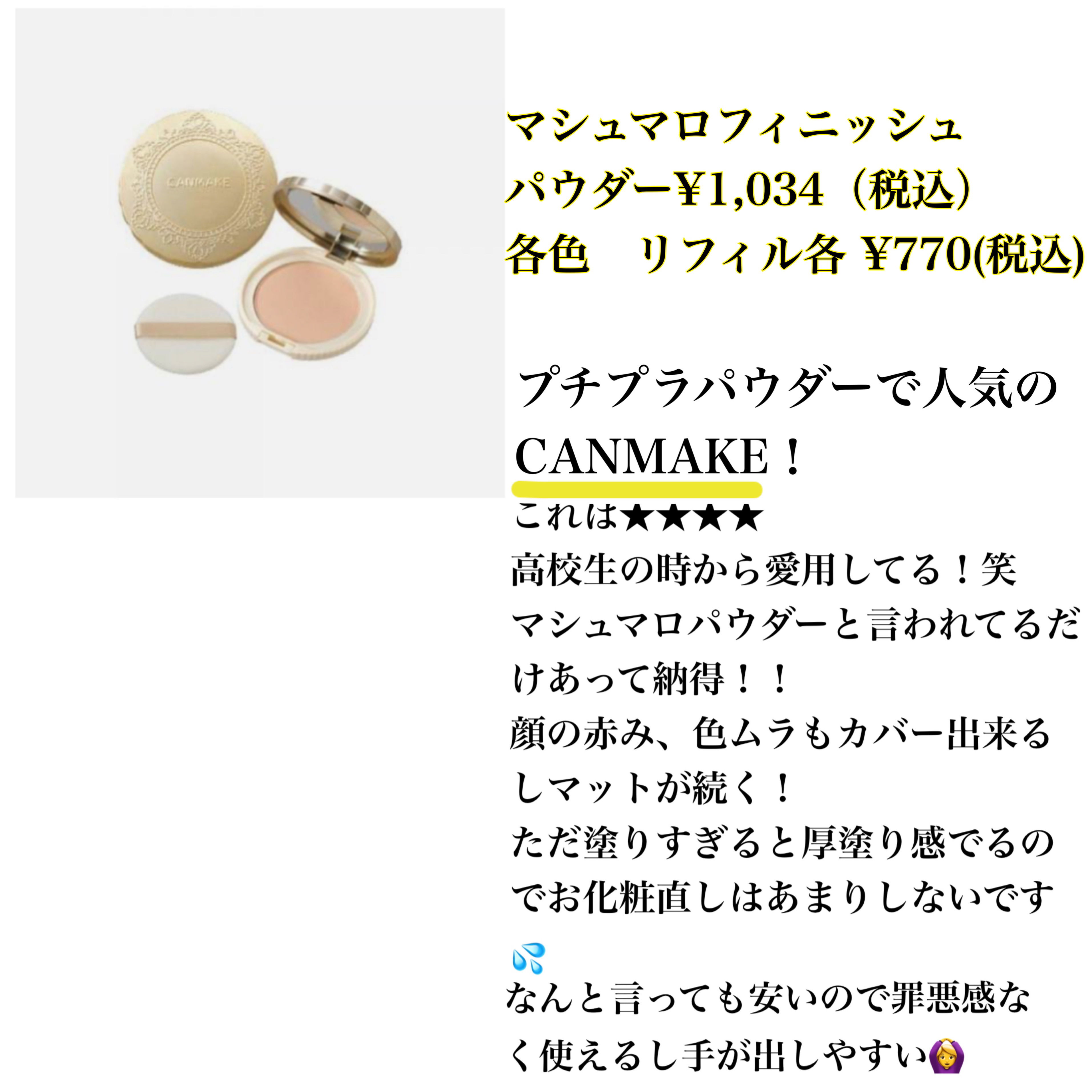 私が使ってきて良いと思ったもの好きじゃなかったものレビューしてるので参考になれば嬉しいです🍀*゜ ちなみにマット好きなのでツヤ系パウダーは選んでません😭 ミラコレ今のところナンバーワンだけど無くなったらエレガンス購入してみる予定⭕️✌️ キャンメイクマシュマロフィニッシュパウダー ミラノコレクションフェースアップパウダー2023