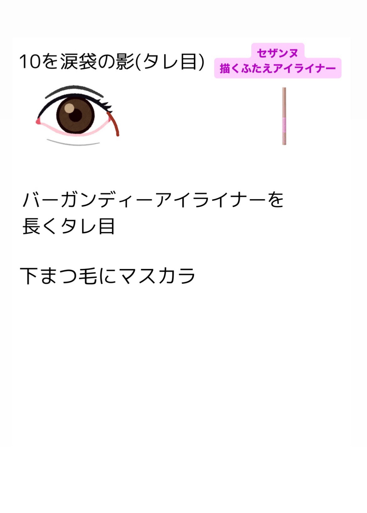 全てdasique04①真ん中をアイホール全体と涙袋に広め②ビューラーして黒マスカラ③ザセムブライトナーを涙袋④右上を涙袋⑤左下を地雷ライン⑥真ん中の段左を上まぶた黒目上と涙袋⑦涙袋ライナーを涙袋の影⑧アイライナーをひく...