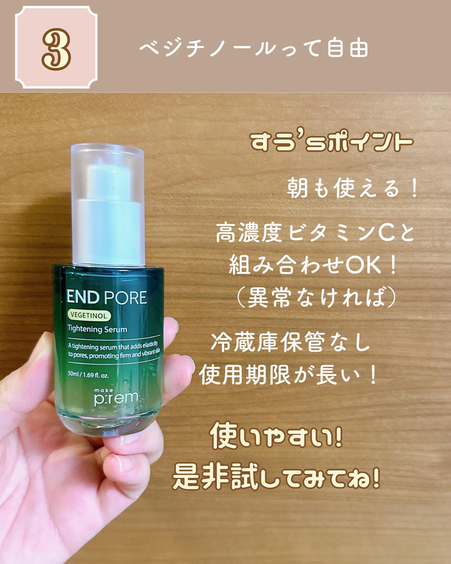 レチノール類似成分であるバクチオール配合で、刺激を少なく毛穴ケアができちゃう💚 メイクプレムが独自開発した毛穴ケアレシピ「ベジチノール10,000ppm」が配合された美容液💚 低刺激で毎日使える毛穴ケア美容液をお探しの方におすすめ!!