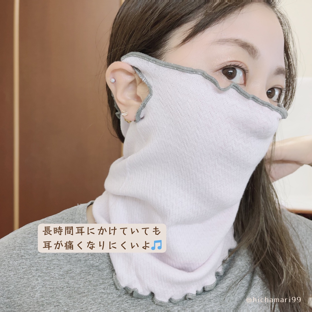 触り心地はやわらかくて軽い。 放湿性と吸湿性に優れているそうで、蒸れないし乾燥しにくいからオールシーズン快適に使えそうです。 耳掛けをとればネックウォーマーとしても活躍✨ 防寒と乾燥対策に自然で優しい使い心地のマスクおすすめです😊💖