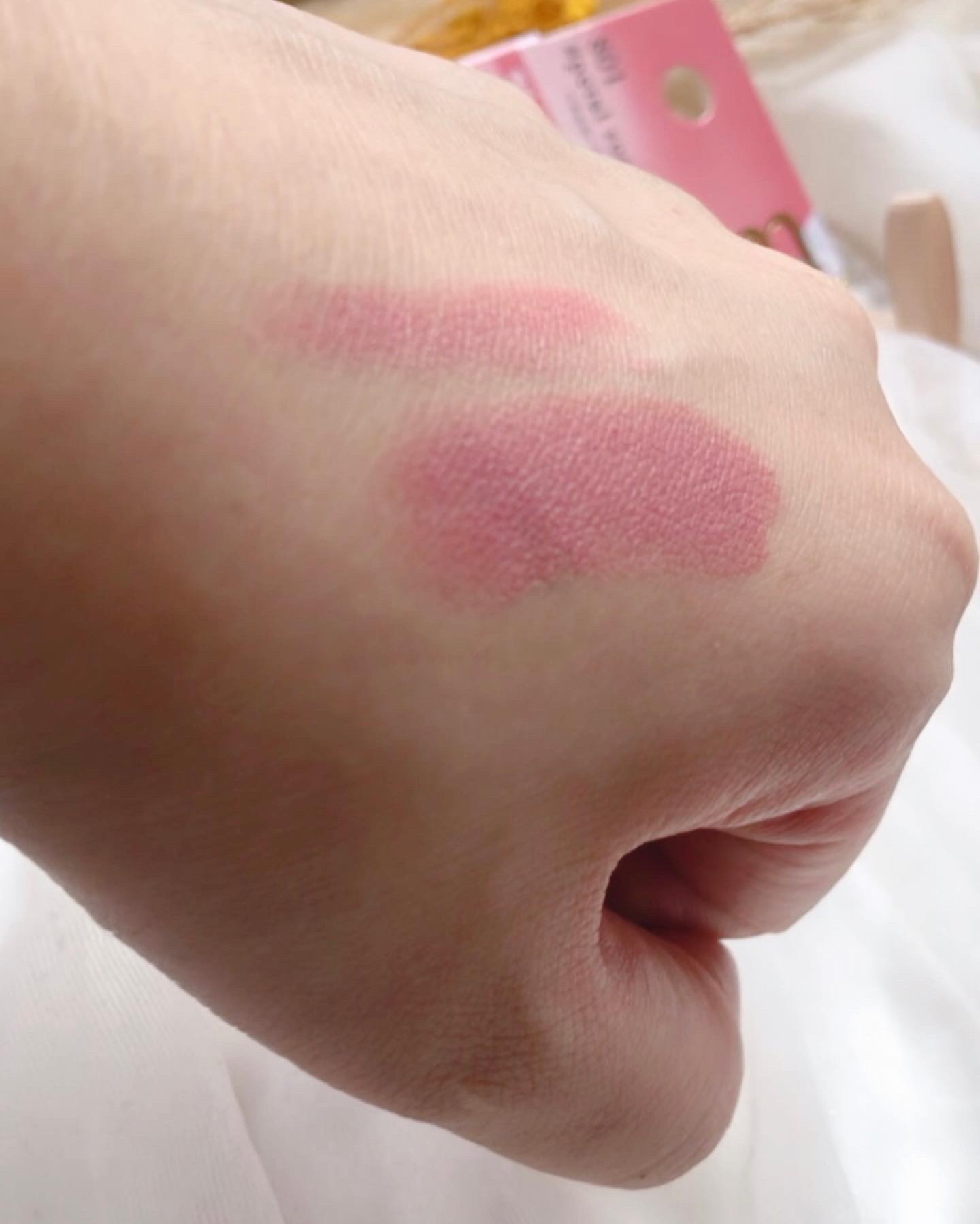 じゅんわり色づくスティックチーク😳 反対側にはぽんぽんぼかせるパフ付き! 801はほんのり青みのあるピンク! ほほ、鼻先、あご先につけてみた🩷 めっちゃ可愛くない😍? リップとしても使えるよ! 発色いいからつけすぎないでパフや指でぼかして使って😉